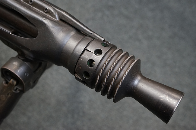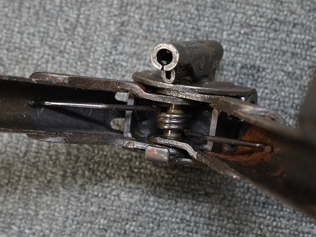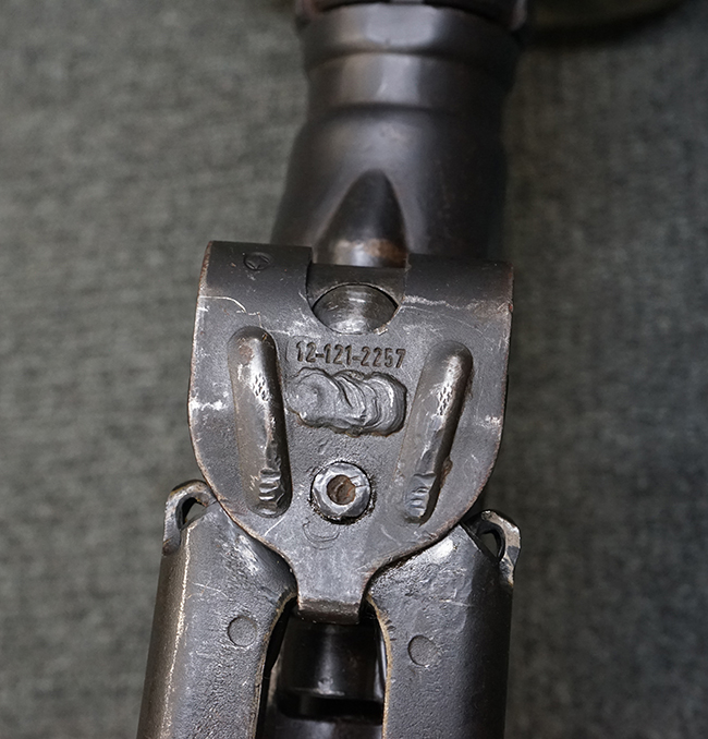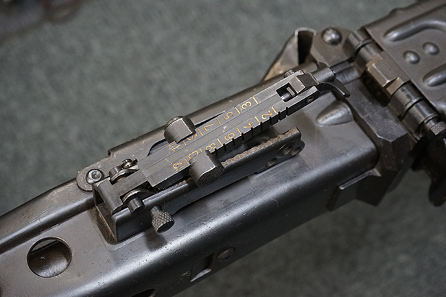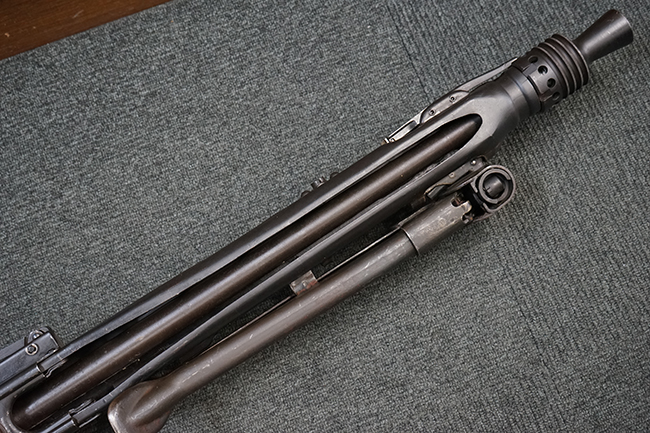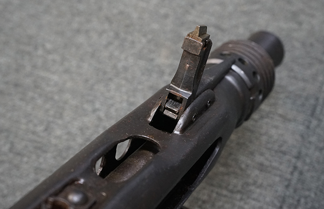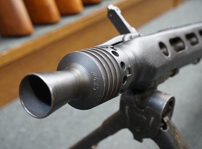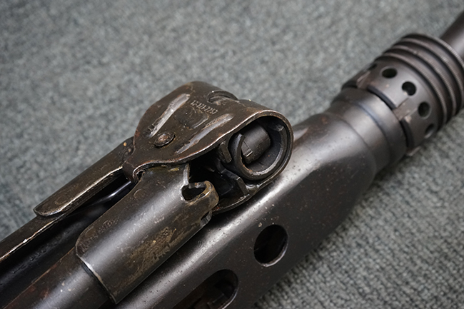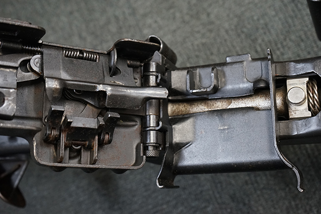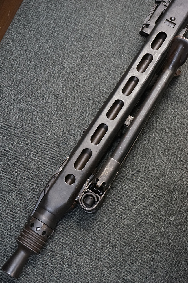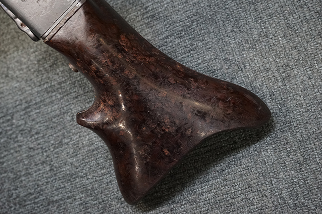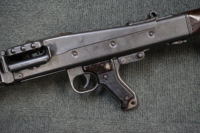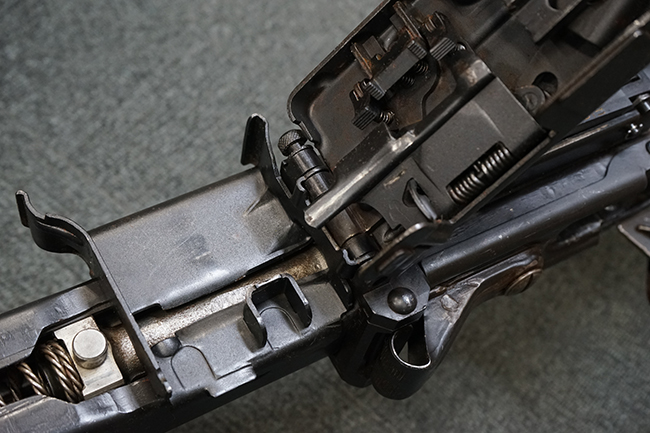 レシーバー左後方側面にはシリアルNo.及びグストロフ社製を示すdfbの刻印が入っており、小部品には大戦中の刻印が打たれています。 また、フィード・カバーにはMG2への改造を示すと思われる「2」のマーキングが施されています。 二脚やフィード・カバー、前後のサイトの起倒は問題ありません。 機関部下面の排莢カバーの開閉やセーフティの切り替えについては問題なく行う事が可能です。 銃身交換ラッチは開く事ができますが、銃身を引き出すハンドが切断されています。 本品は元々フランスの無可動加工が施されていた品で、銃身交換ラッチ周辺やフィード・カバー後端、レシーバー後端下部付近に溶接痕が見受けられます。 バット・ストックは捻じり方向にぐらつきがありますが、MG42の仕様とも言える状態です。