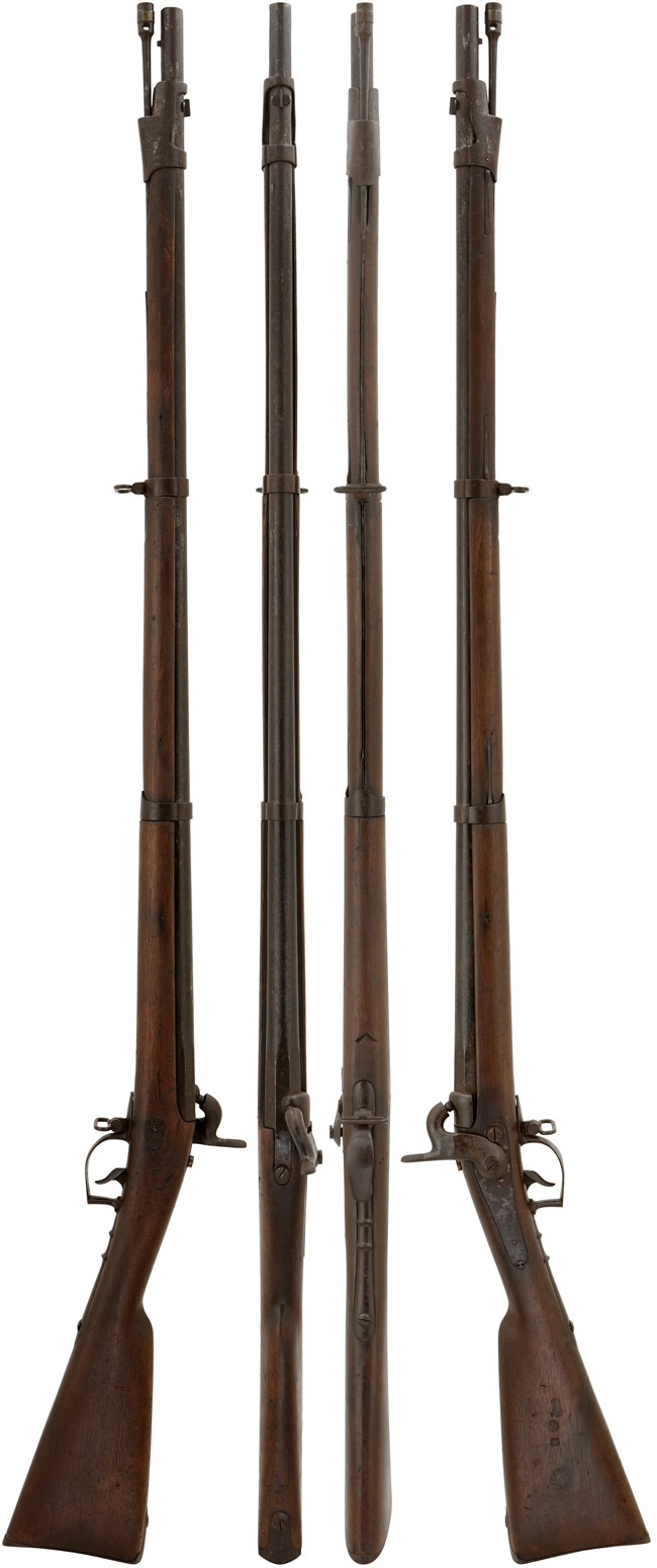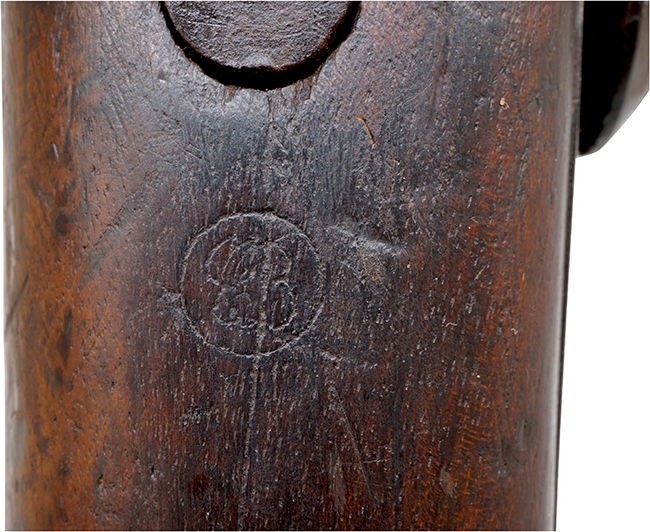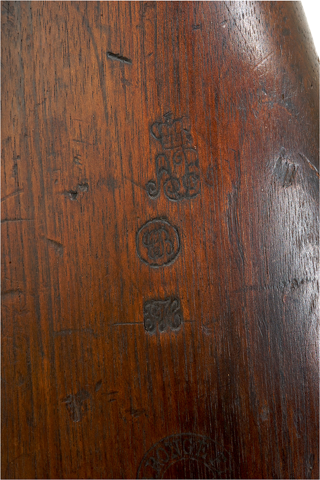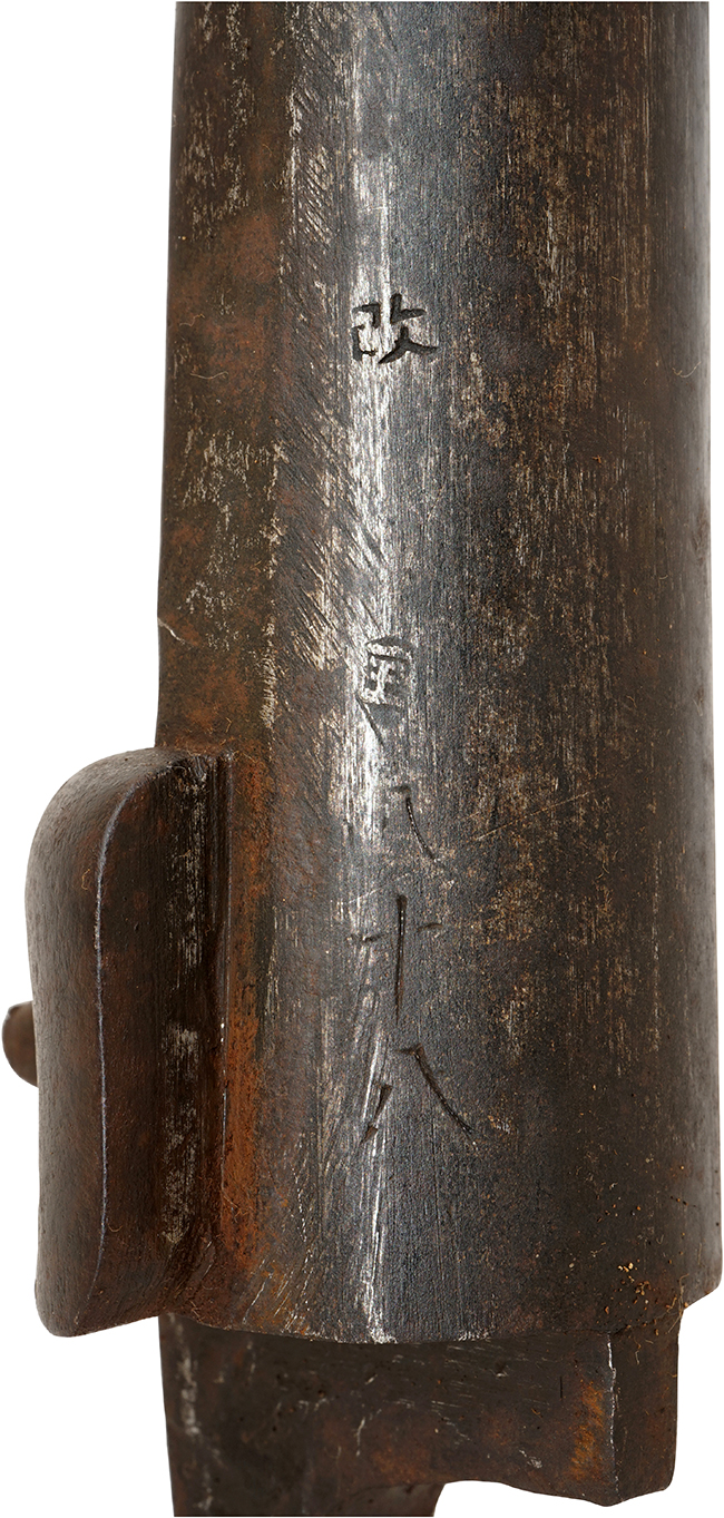 本品は総称として国内では「3バンド ゲベール銃」とも呼ばれている品ですが、ゲベール銃はオランダ製ですので正確ではありません。正式にはフランス軍のMle 1842 マスケットになります。 本品はベルギーで生産された後、フランス軍で使用されたか、直接南北戦争中のアメリカへ輸出した品と思われます。 北軍(Union army)は最初海外からの輸入兵器を多用していましたが、戦争中期から後期になると新型国産兵器を導入しました。 北軍ではベルギーを始め海外からの輸入品は少なくなり、反対に兵器不足に悩む南軍が使用するようになりました。 19世紀中頃のベルギーでは主要産業の一つである銃器の製造に非常に積極的で、ヨーロッパ各国政府から多くの小火器を生産を請け負っていました。 ベルギーは南北戦争中はアメリカへ、そしてその後始まった日本の維新戦争に乗じて大量の兵器を日本へ輸出しました。 本品はベルギーからアメリカ、そして日本に渡って来たものと思われます。 本品の特徴は口径が南北戦争で最も多く使用された.577 口径のラウンド・バレルに薬室部分の約5cmがオクタゴン・バレルになっている点です。 またサイド・プレートは米国製や英国製と事なり、バックサイドと呼ばれるサイドプレートの前方にハンマーが位置し、サイドプレート後部の一部がバットストックのグリップ部分(比較的強度的に弱い部分)を補強する役目をしています。 トリガーガードの楕円形部分後部がスクエアーになった珍しいタイプです。 またトリガーガードから後方に伸びるタング部分には指を掛ける突起が二つ付いています。 ストックにはベルギーのリェージュの銃工であるManufacture d’armes RONGE Jean-Baptiste fils S.A.社の「LIEGE J.B.ROWGE FILS」と入った円形刻印がバットストック右側面に打たれてあります。 またそれと同じ側に「王冠とAR」「EB」「サイファ(筆記体アルファベットの組み合わせ)」の刻印が打たれており、王冠の刻印はベルギーで他の二つは米国の刻印ではないでしょうか。 銃身のアッパー・タングの後ろの木部にもバットストック右側と同じ「ER」の刻印が打たれています。鉄製のバレル・バンド等に「王冠にB」のインスペクション刻印が打たれいます。銃身下部に「改 (国?) 八十八」の刻印が見られる事から明らかに幕末の日本で使用した事が分かります。