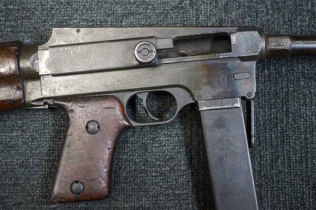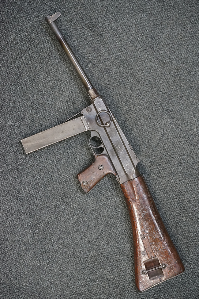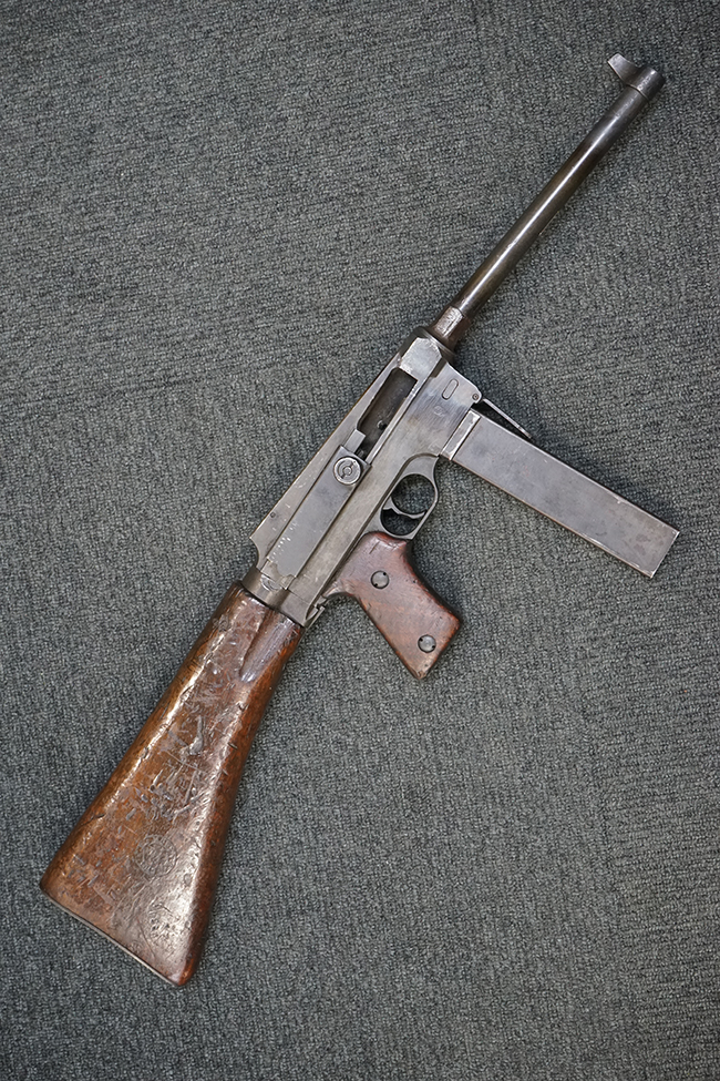 フランスが独自開発し、1938年にフランス軍制式採用となった短機関銃です。 その開発の始まりは古く、1918と1922年に行われた「小火器開発プログラム」がきっかけでした。 本銃は反動の軽減を狙って、銃身軸に対して機関部が斜め後方に傾斜したデザインとなっています。 また、セーフティはトリガーそのものを前方に回転させて機能する他、排莢口だけでなくマガジン挿入口にもカバーが設けられているなど、独特の設計となっています。 フロント・サイト及びリア・サイトはやや左寄りにオフセットされており、100mと200mの切り替え式のリア・サイトを折り畳むと本体上面がフラットになるのも特徴です。 また、通常分解を工具無しで容易に行える点も当時としては採用例が少ないものでした。