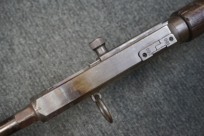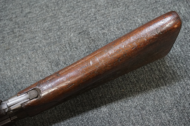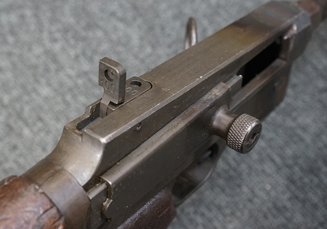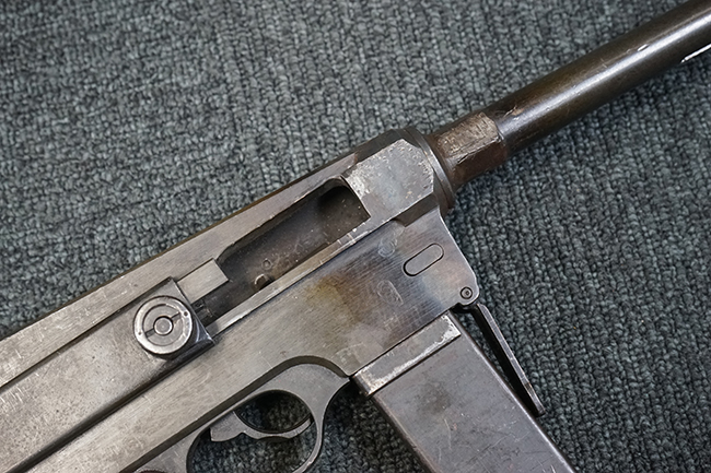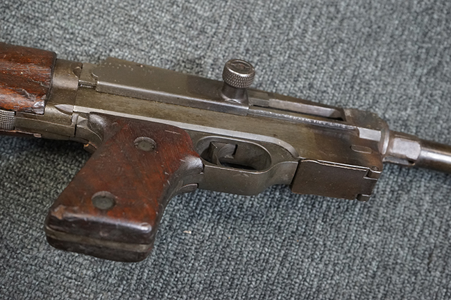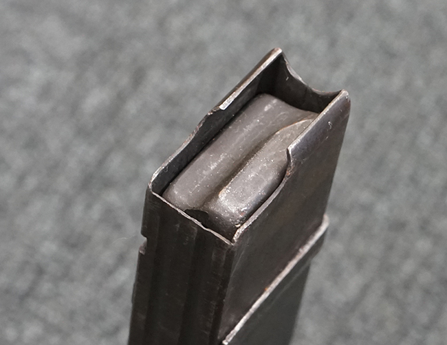 全体に使用感が見受けられ、金属部は小傷や擦れが見受けられますが、大きな破損や欠損は見受けられません。 スリング・スイベル・リングの基部やレシーバーの角部等に擦れが見られるものの、大きな錆や朽ち込みは見られず比較的しっかりした状態が保たれています。 傷み易いバット・プレート部に関しても僅かな擦れや打ち傷が見られるのみで、表面仕上げもしっかりと残っています。 木製グリップやバット・ストックについても金属部同様に使用感が見られ、欠け痕や打ち傷、クラックが見受けられます。 なお、グリップ、ストック共に銃本体にしっかり取り付けられているため、ガタツキ等は見られません。 以上の点から木部は強度的にしっかりとした状態が保たれています。 リア・サイトの起倒やマガジンのダスト・カバーの開閉は問題なく行う事が可能です。 マガジン装着時に若干のガタが見られますが、ロックはしっかりと掛かり、脱落してしまう心配はありません。 マガジン着脱も問題なく行うことが出来ます。