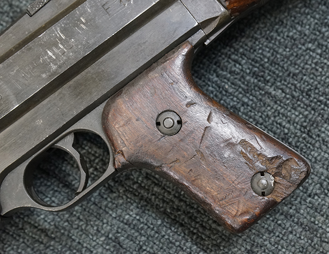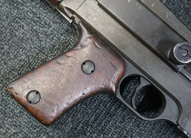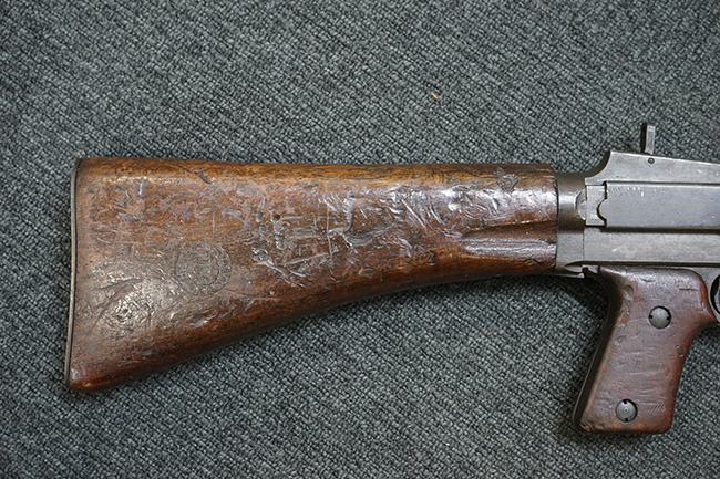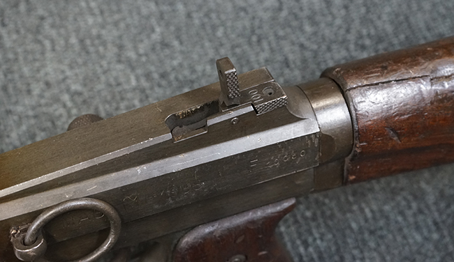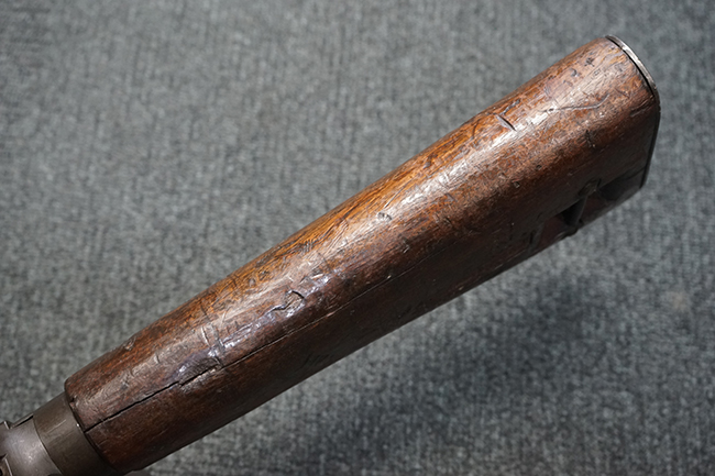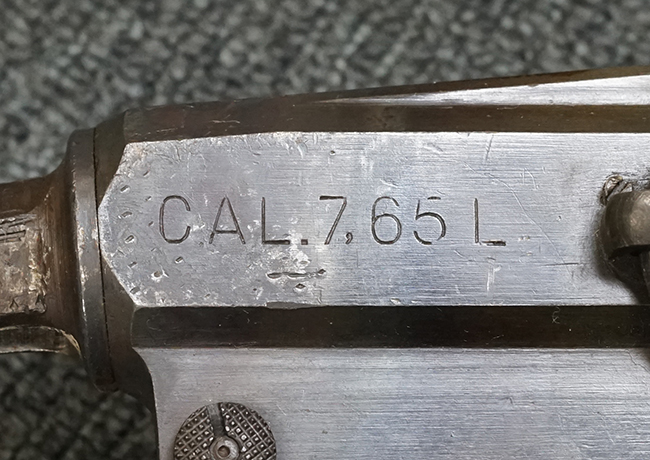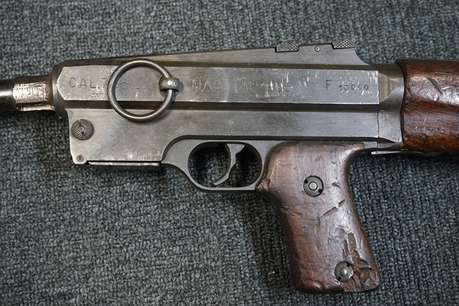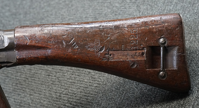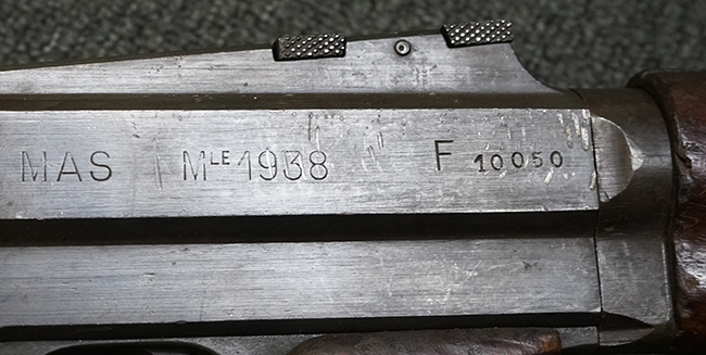 本品のレシーバー左側面にはシリアルNo.F10050の他、「CAL 7,65L MAS MLE1938」のモデル名刻印が入っています。 木製ストック左面に「A SALVE」と「8225」、右面にはやや不鮮明なものの「AOUT S MA 1942」等の打刻が見られます。