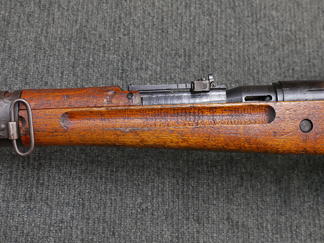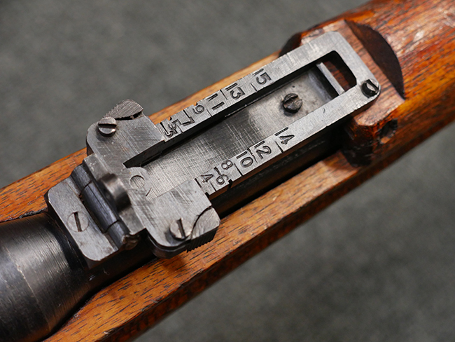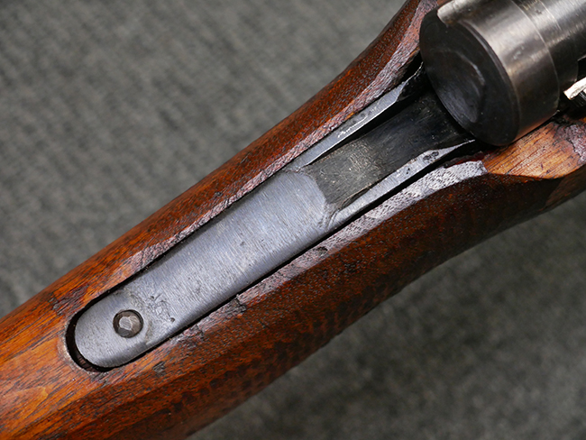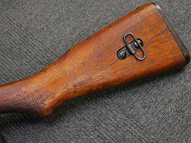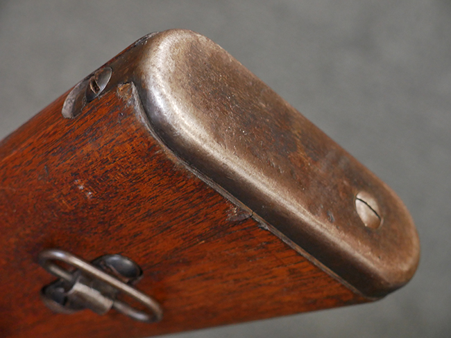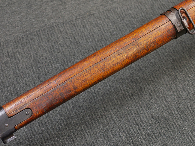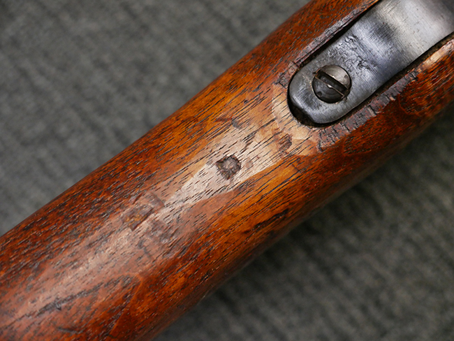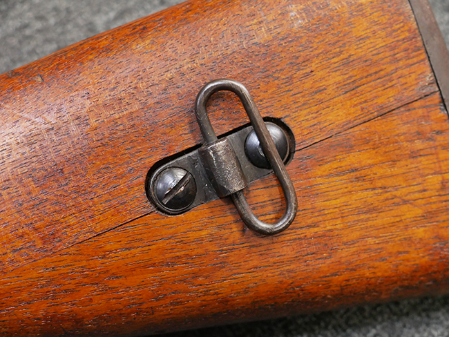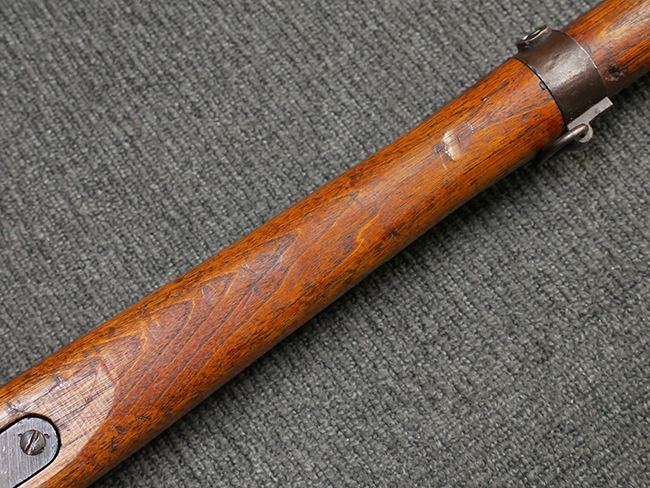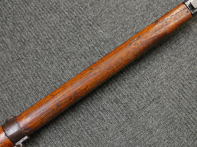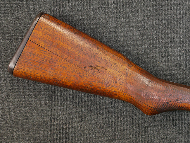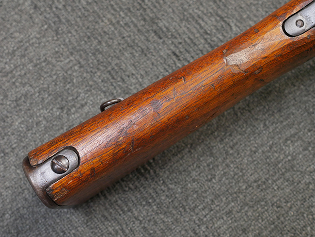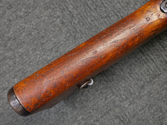 本品の金属部はやや打ち傷や擦れ、経年による褪色等は見られるものの、目立った欠損等は見られず、オリジナルの黒染め仕上げも比較的残っています。 木製銃床については、やや打ち傷や線傷、若干の表面的な欠けが見られるものの、大きな破損や欠損等は見られず、各部の取り付けもがたつきもなくしっかりとしています。 旧軍小銃特有の銃床上下の継ぎ目については、僅かに隙間が見られるものの、現状がたつきなどは見られません。 床尾板については、やや打ち傷や擦れ、一部仕上げが落ちて金属の地肌が表れている箇所が見られますが、現状大きな変形等は見受けられます。 照尺の起倒・調整や弾倉底板の開閉については問題なく行う事が可能です。