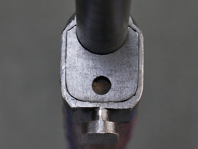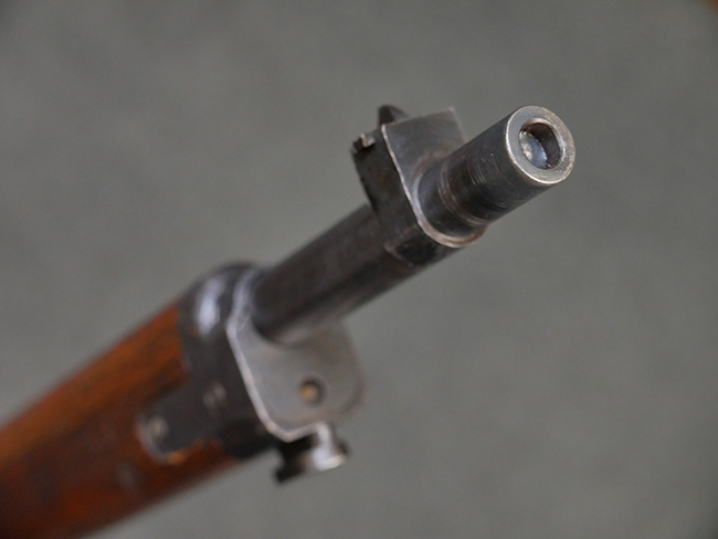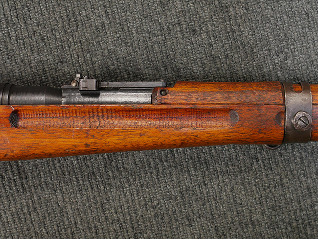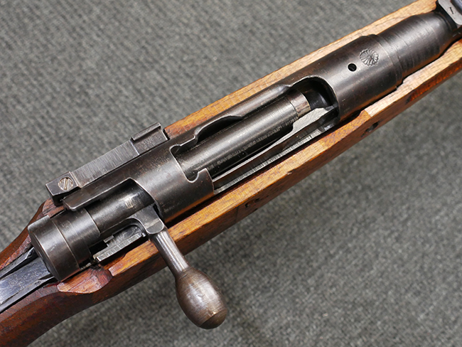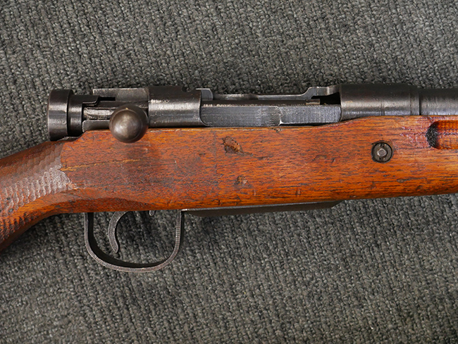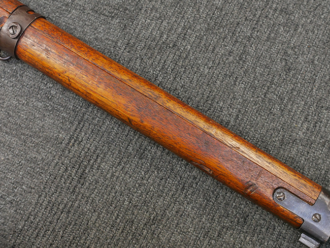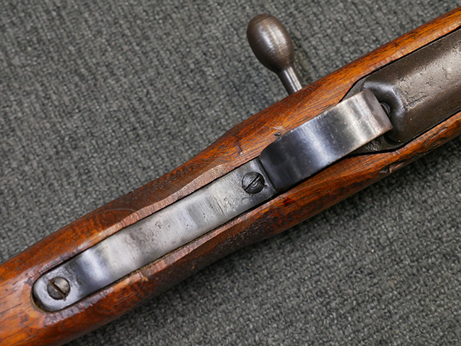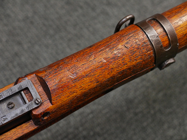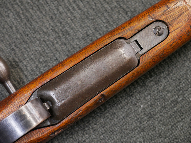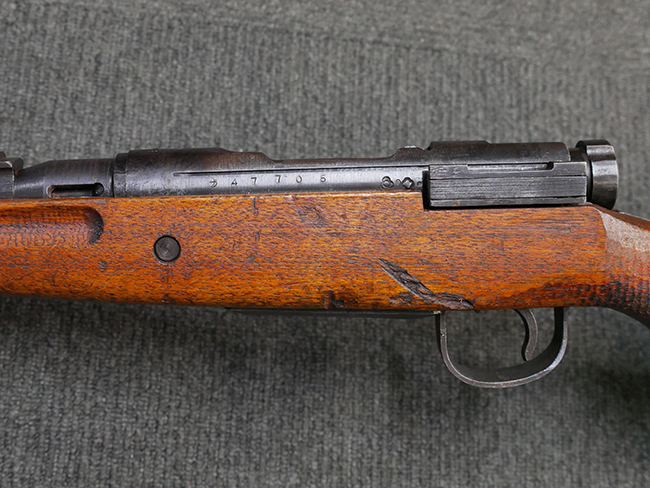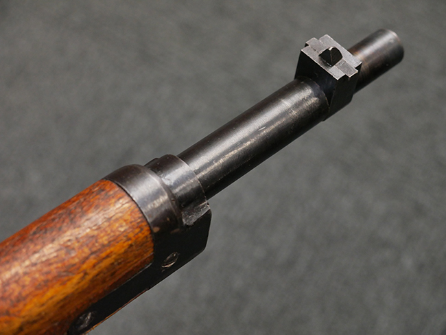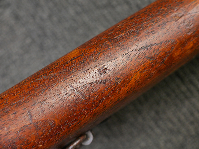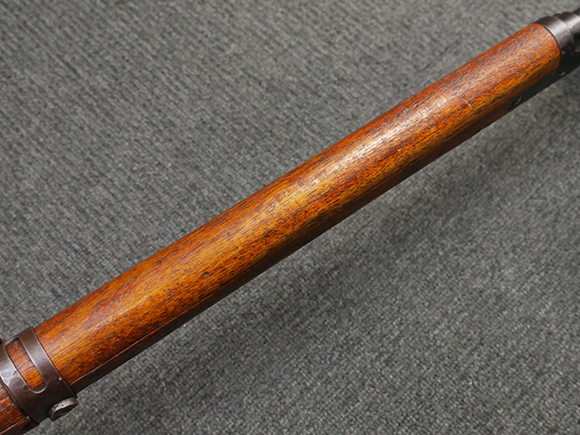 本品の金属部はやや打ち傷や擦れ、経年による褪色等は見られるものの、目立った欠損等は見られず、オリジナルの黒染め仕上げも比較的残っています。 木製銃床については、やや打ち傷や線傷、若干の表面的な欠けが見られるものの、大きな破損や欠損等は見られず、各部の取り付けもがたつきもなくしっかりとしています。 旧軍小銃特有の銃床上下の継ぎ目については、僅かに隙間が見られるものの、現状がたつきなどは見られません。 床尾板については、やや打ち傷や擦れ、一部仕上げが落ちて金属の地肌が表れている箇所が見られますが、現状大きな変形等は見受けられます。 照尺の起倒・調整や弾倉底板の開閉については問題なく行う事が可能です。