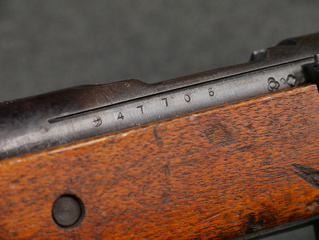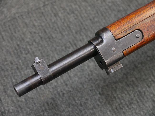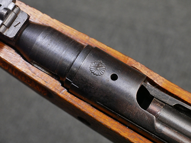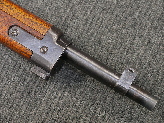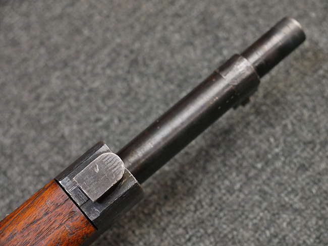 本品は九九式短小銃 中期型 (東京重機製) です。 東京重機工業は1938年12月に設立、東京都北多摩郡に所在し、戦中は九二式重機関銃や九九式短小銃を主に製造しました。 機関部左側面にはシリアルNo.47705の他、東京重機製を示す刻印や「サ」のシリーズ名が打刻されています。 薬室上面の菊花紋章は上から打ち傷により打ち消されています。 尚、「九九式」の刻印は元々打刻されていません。 尚、本品は元々さく杖の取り付けが出来ない構造となっています。
