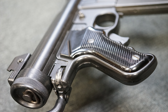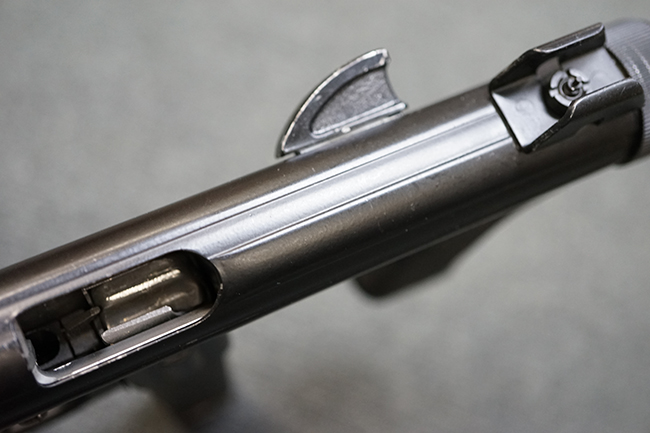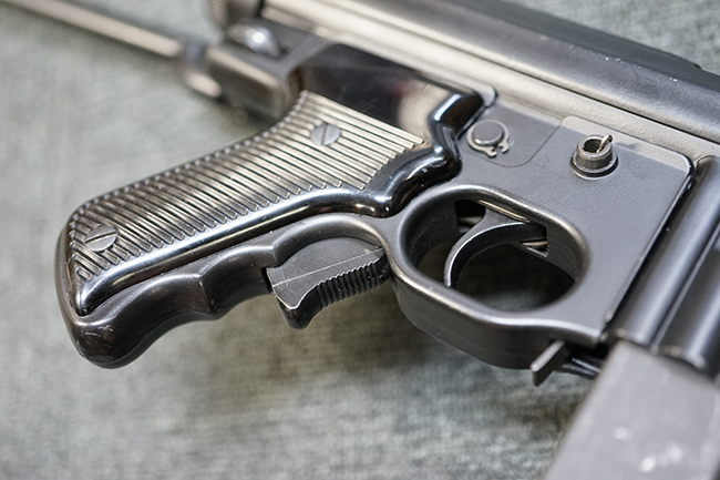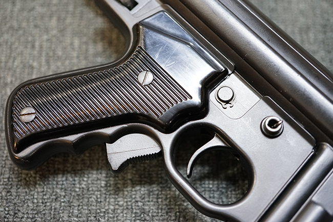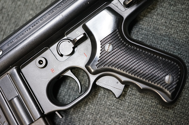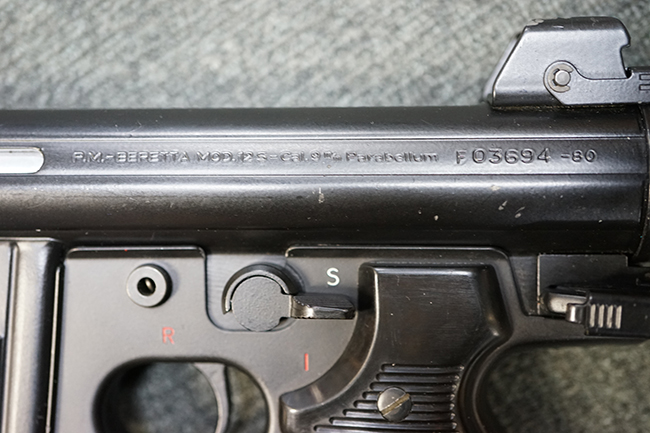 本品のレシーバー左側面にはシリアルNo.の他、「P.M.-BERETTA MOD.12S-Cal.9m/m Parabellum」メーカー刻印及びモデル名の刻印が入っています。