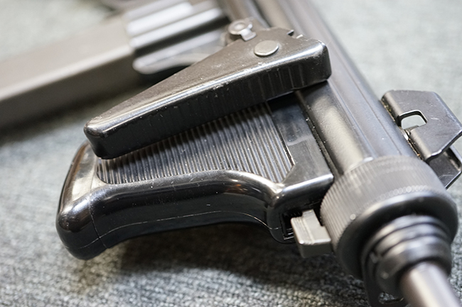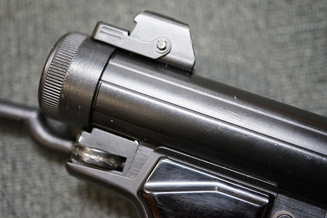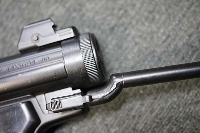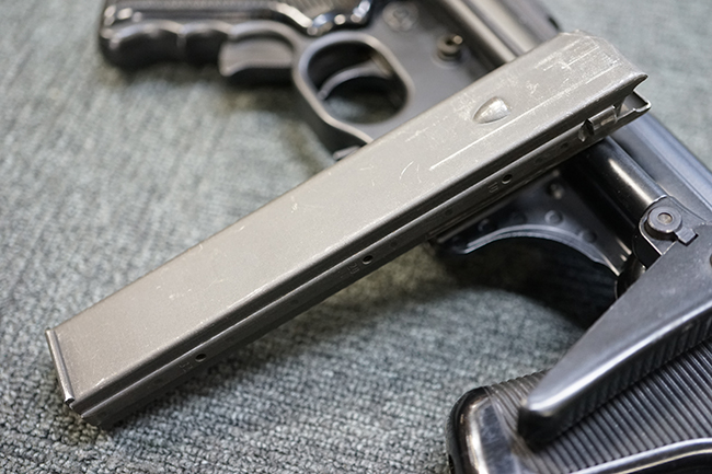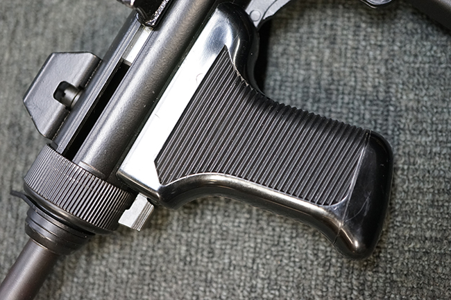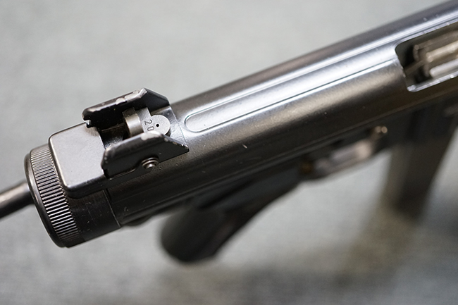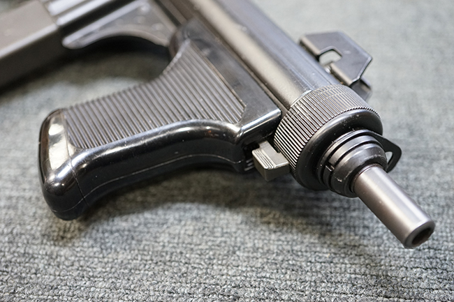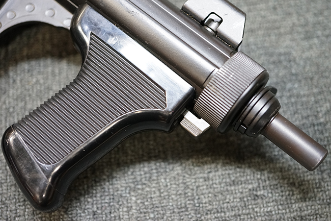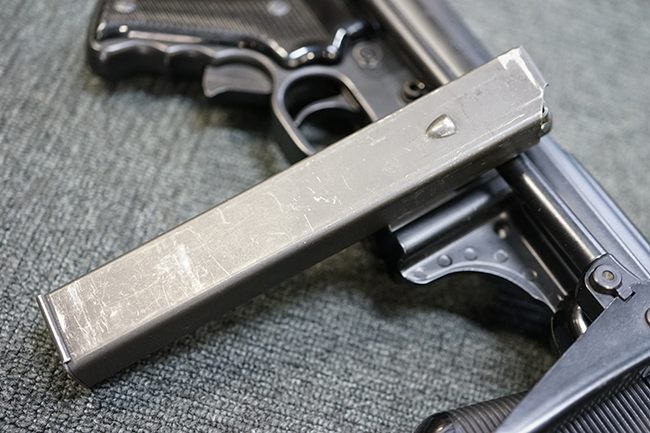 本品は全体に使用感は比較的少なく、金属部は若干の小傷や擦れは見られるものの、目立った欠損等は見られず、全体にオリジナルの黒色焼付塗装仕上げが残った良好な状態が保たれています。 黒色樹脂製のフォア・グリップやグリップについても、若干の打ち傷や線傷は見られるものの、大きな破損等は見られず、こちらもコンディションは比較的良好です。 マガジンの着脱やリア・サイトの切り替え、ストックの展開及び折り畳み操作については問題なく行う事が可能です。 付属のマガジンについても、若干の小傷や擦れは見られるものの、現状目立った凹みや変形等は見受けられません。 尚、マガジンは一部が固定されています。