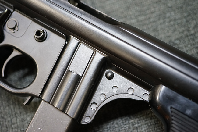 M12短機関銃の作動方式はオープン・ボルト方式のシンプル・ブローバックで、銃本体はプレス加工と溶接による生産性に優れた設計がなされており、L型ボルトの採用により全長の短縮を図っています。 また、引き金をロックするマニュアル・セーフティに加えて、トリガー及びボルトをロックするグリップ・セーフティが装備されています。 ストックは本体右側面に折り畳み可能なワイヤー・ストックが装備されていますが、初期には着脱式の木製バット・ストックを装備したモデルも少数製造されました。 尚、M12ではマニュアル・セーフティ及びセレクターはそれぞれが独立した貫通式のボタンとなっていますが、改良型のM12Sではマニュアル・セーフティとセレクターの機能を統合したレバー式に変更されました。 (KK)