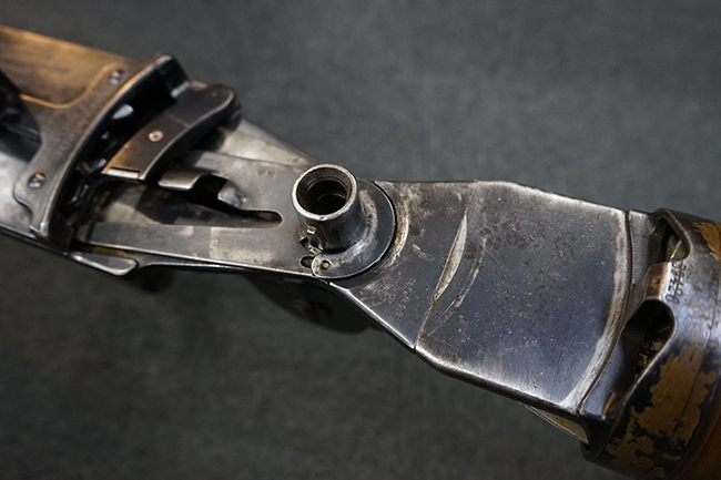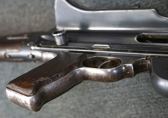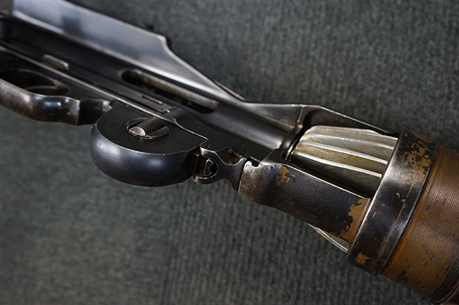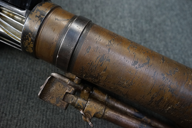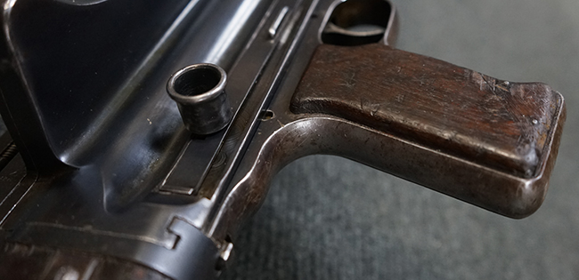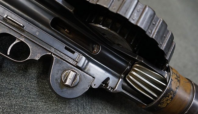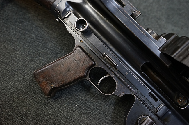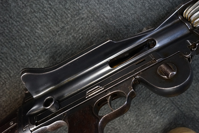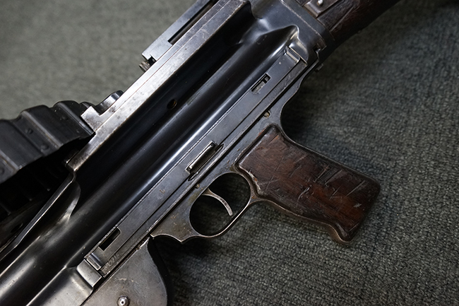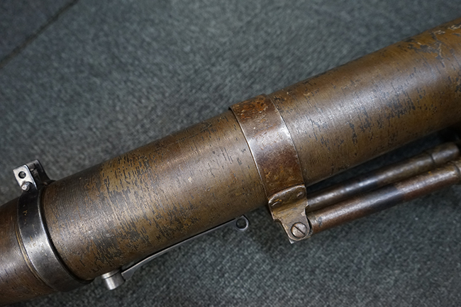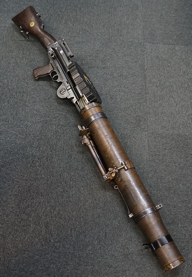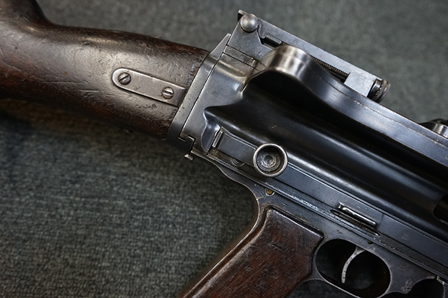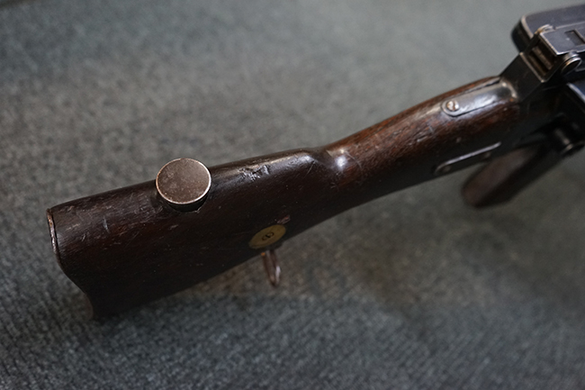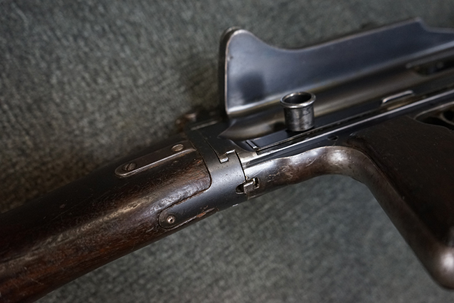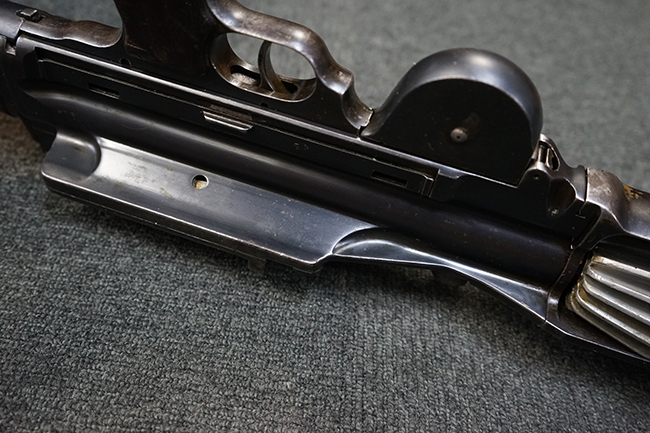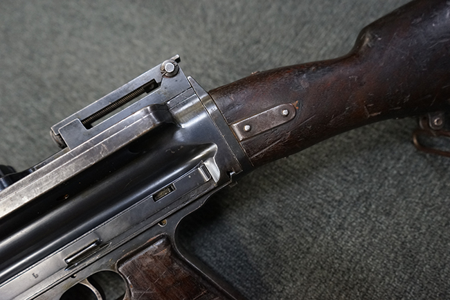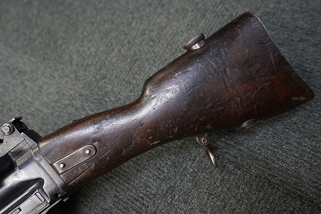 本品は全体に適度な使用感のある良い雰囲気となっており、機関部やバレル・ジャケットは、やや小傷や擦れ、若干の経年による褪色が見られるものの、目立った欠損等は見られず、レシーバーのブルー仕上げ等も比較的残っています。 木製のグリップやバット・ストックについても、やや打ち傷や線傷、僅かな欠けが散見されるものの、こちらも目立った破損や欠損等は見られず、概ねしっかりとした状態が保たれています。 バット・プレート部は全体に仕上げが薄くなり、打ち傷や表面錆痕が見られるものの、大きな変形やがたつき等は現状見受けられません。 マガジンの着脱や二脚の展開、リア・サイトの起倒・調整については問題なく行う事が可能です。