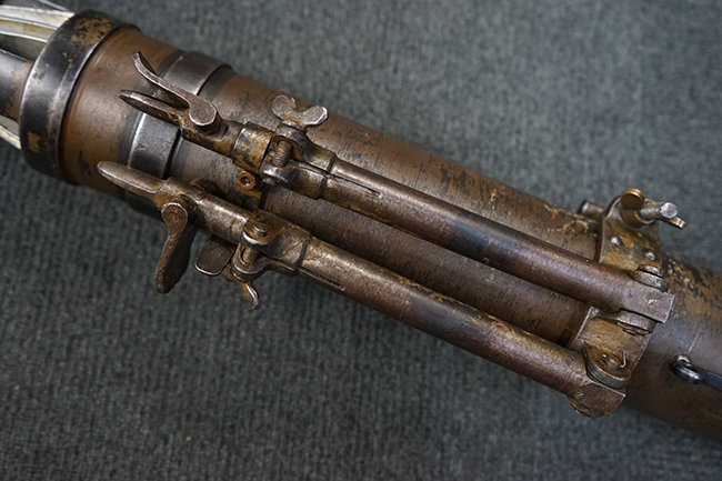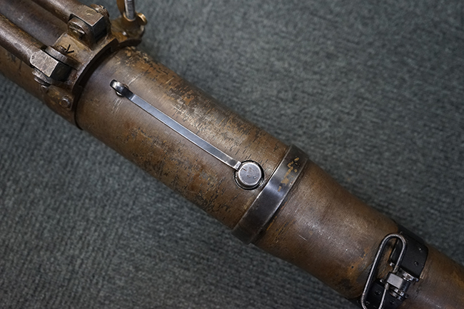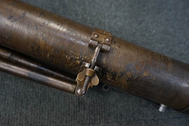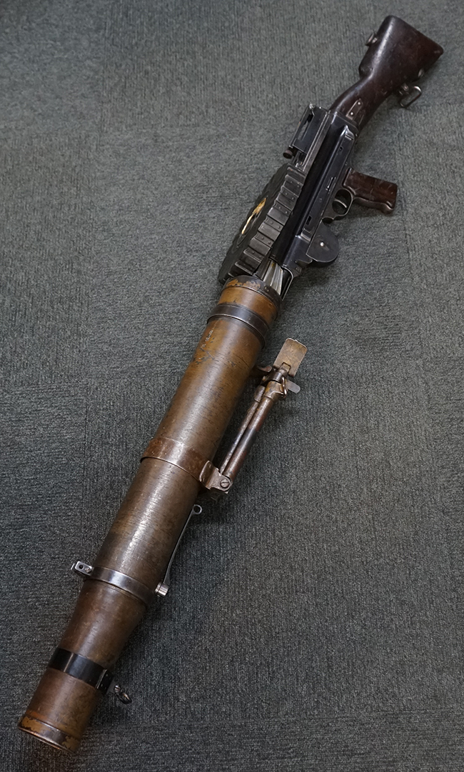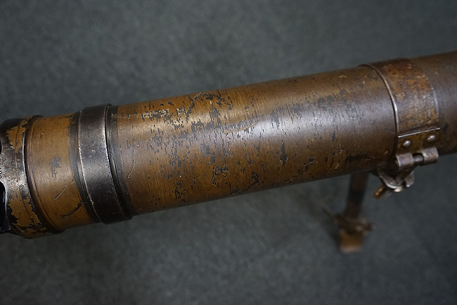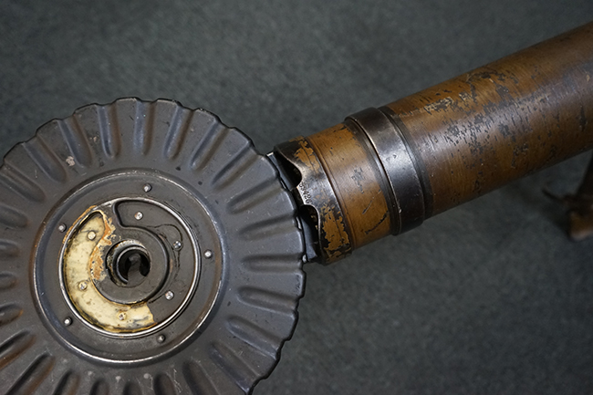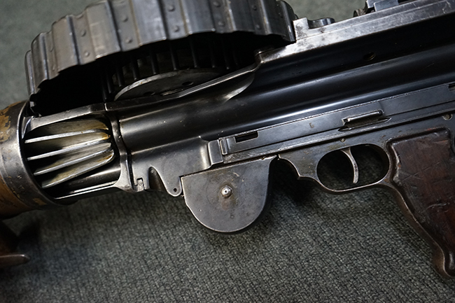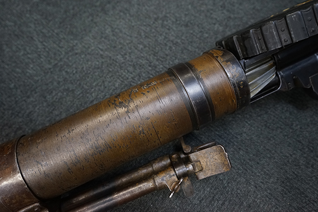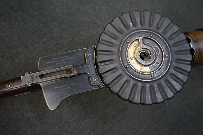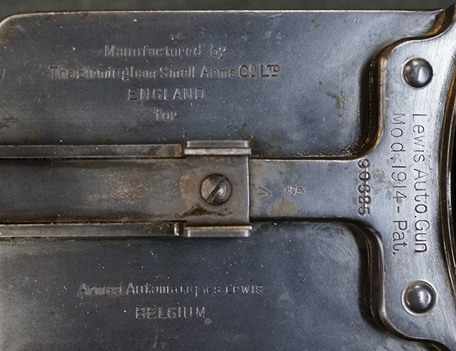 本品は英国バーミンガム・スモール・アームズ (BSA) 社が生産したルイス M1914 軽機関銃で、レシーバー上面には「Manufactured by The Birmingham Small Arms CO LTD ENGLAND」の刻印に加えて、「Armes Automatiques Lewis BELGIUM」のルイス社の刻印も確認出来ます。 レシーバー上面には他にも「Lewis Auto. Gun Mod.1914 - Pat.」のモデル名刻印が打刻されています。