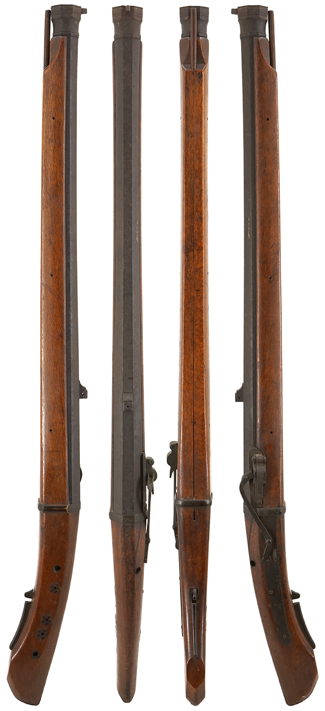 本品の銃身は後方に向かって緩やかに広がった八角銃身です。 八角柑子の銃口周りには筋立された細い環が施されており、その環の間の八角の各面に円弧を描いた帯が施されています。 この柑子は中筒では一般的な形状ですが、本品の八角柑子は定番ながらも非常に上手な出来です。 八角形の柑子からキュッと絞られて丸銃身となり玉縁まで繋がっています。柑子の後ろ約2cmほどの丸銃身の後に両縁が細く角の立った筋立は見事で、中央は太く筋立された玉縁(化粧飾りの輪)が施されています、これのような目立たない場所も上手で腕の良い鉄砲鍛冶である事が判ります。先目当は中筒としては小さな三角形、元目当は前半分が円弧を描いて低くなり、後ろ半分が筋割となってた紀州独特の形状をしており、これも中筒としては小さく紀州筒らしいです。 銃身は台 (銃床) に対して3ヵ所の目釘により取り付けられる構造となっており、目釘穴の周りにの飾金具はありません。 銃床は全体に装飾は控えめとなっており、火挟の軸は無地の小型の丸型、カラクリの地板鋲の飾り金具(3か所)は桜花の飾りになっている以外は目立った装飾などは見受けられません。 武骨ですが上等な紀州中筒の典型的な造りになっています。カラクリは蟹目のある内カラクリとなっており、カラクリの地板や胴金、火蓋といった主要な金属部分は真鍮製となっています。 断面が角ばった火挟と後部上方半分が緩やかに円弧を描いている雨覆いは鉄製で、雨覆いはマイナス螺子で固定されているのも紀州筒の特徴です。 胴金幅は12?个任后0?金についても真鍮製の三角形に近い舌形で、用心金は設けられていません。引金の後ろにナマコ金が付いており、台カブの握り部分はやや太く、庵のカーブや形状が紀州細筒と似た形状をしています。火縄通しの穴と火縄消しの穴はシンプルな真鍮製の丸型です。 これほど紀州中筒の特徴を持った中筒は非常に珍しいです。(MM)