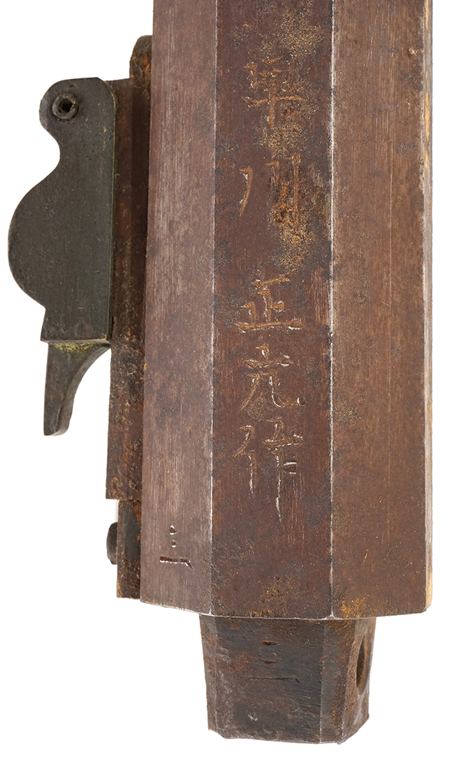 本品は在銘品で銃身には「土佐藩工 早川正光作」の銘が正に堂々と切られており、その見事な銘ぶり銘文が真正なのが伺われます。 立派な「土佐藩工」の銘文から作者は「土佐藩工」であった事が明確に判りますが、本品は紀州=紀国 (きのくに: 現在の和歌山県)で製作された紀州筒の掟に沿った品です。典型的な紀州の中筒です。 作風から紀州の「早川甚之助正光」と同人と思われます。「早川正光」は「全国鉄砲鍛冶銘鑑」P.248及び「全国鉄砲鍛冶銘地域別分類」P.244 に紀州住の早川甚之助正光」として掲載されています。