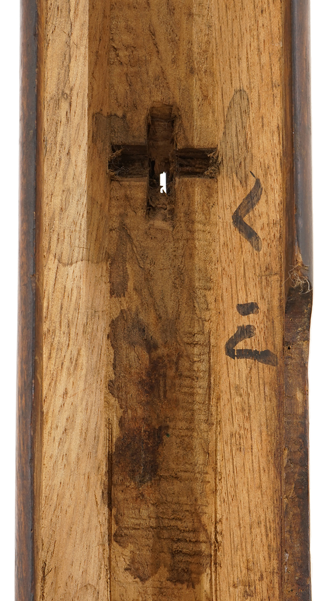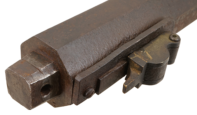 本品の筒 (銃身) を含む鉄部分は古い刀の茎のような黒錆に覆われていますが、これは当時の日本における防錆方法であった錆付けによるもので、欧米のようにブルー仕上げがなかった日本では一般的なものでした。 銃身にはやや表面錆が見受けられるものの、全体としては目立った欠損等は見られず、概ね良好な状態が保たれています。 銃身下面に切られた銘については大きくはっきりと見事に残っています。 銃身下面の目釘金具の位置と銃床の目釘穴の位置は3箇所とも一致しています。 尚、目釘は付属しておりません。銃床は胴締金の後ろに線状のヒビが入ってしまっている他は気になる破損等は見受けられず、概ね良好なコンディションが保たれています。