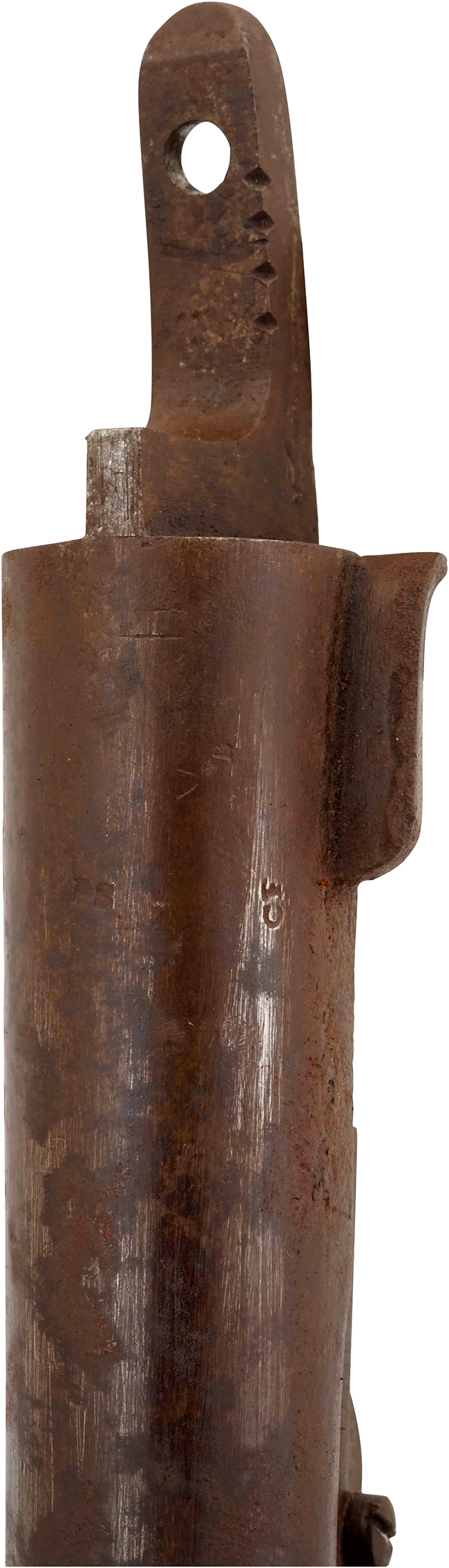 本品の銃身や機関部といった金属部は、全体にやや時代錆や表面錆痕が見受けられ、一部朽ち込み痕が見られるものの、大きな欠損は見られず、概ねしっかりとした状態が保たれています。 木製銃床については、やや打ち傷や線傷の他、一部に若干の欠けが見られますが、大きな破損等は見られず、各部の取り付けについても目立ったがたつき等は見受けられません。 傷み易いバット・プレートについては、全体に時代錆が表れており、一部に表面錆痕や朽ち込み痕が見られるものの、銃床への取り付けはがたつきもなくしっかりとしています。 尚、前後スリング・スイベルは現状固着しています。 リア・サイトの調整については問題なく行う事が可能です。