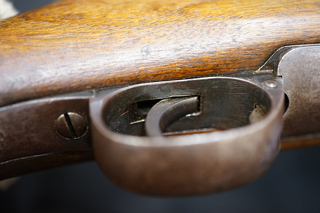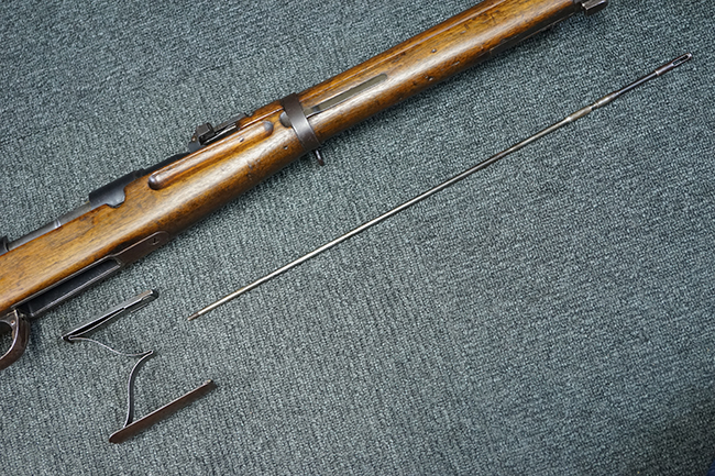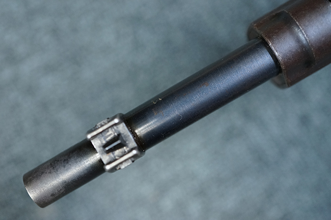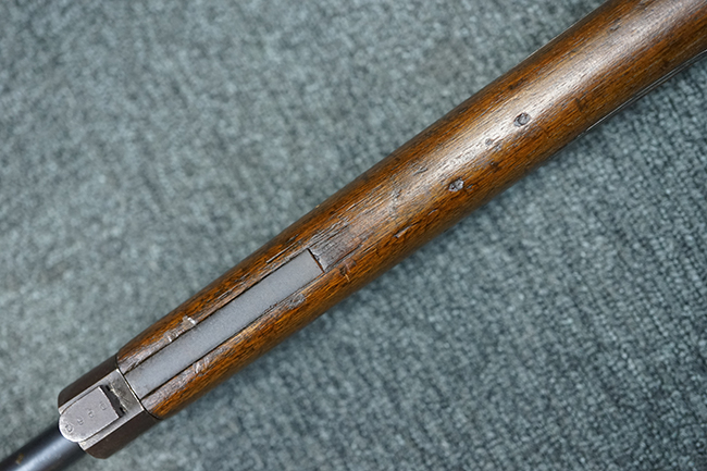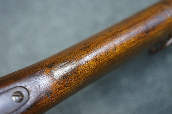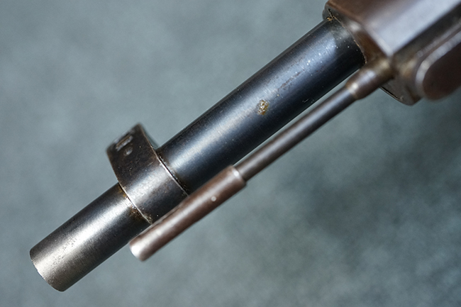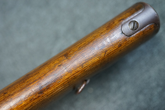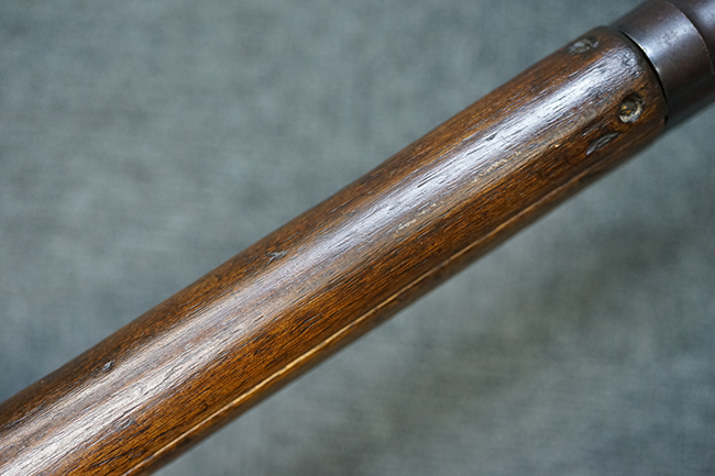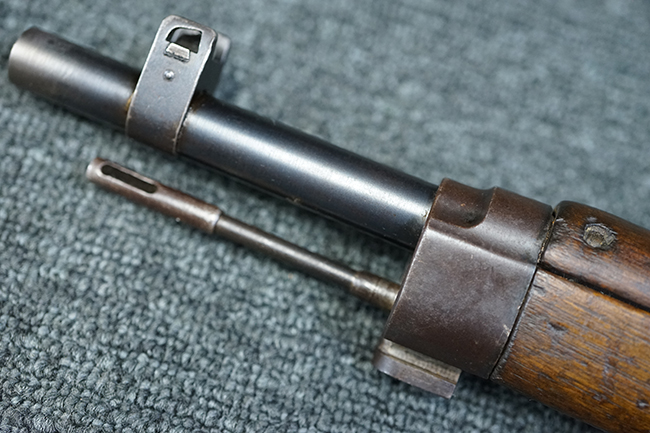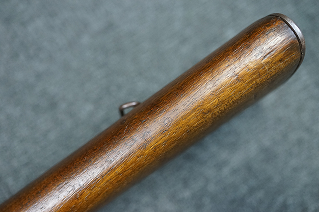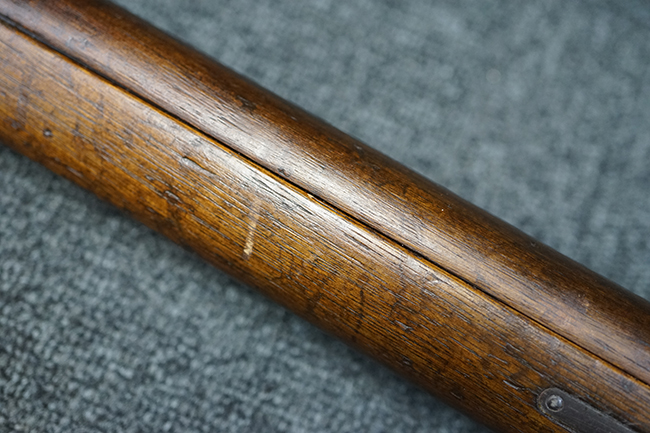 本品の機関部や銃身といった金属部は、やや小傷や擦れ、経年による褪色の他、一部に時代錆や表面錆等は見受けられるものの、目立った欠損等は見られず、機関部にはオリジナルのブルー仕上げも確認出来ます。 尚、用心鉄や弾倉底板については、大部分に仕上げが落ちて、時代錆や表面錆痕が表れています。 木製銃床や木被については、全体に仕上げ直しが施され、やや打ち傷や線傷が見られるものの、大きな破損や欠損等は見られず、概ねしっかりとした状態が保たれています。 旧軍小銃特有の銃床上下の継ぎ目については、僅かに隙間が見られるものの、現状目立ったがたつき等は見られません。 床尾板については全体にやや経年による褪色や時代錆、仕上げが薄くなり金属の地肌が表れている箇所が見受けられ、銃床への取付部に若干の隙間が見られますが、取り付けについてはがたつきもなくしっかりとしています。 照尺の起倒・調整や弾倉底板の着脱については問題なく行う事が可能です。 弾倉内の弾受け (フォロワー) 及びバネは入っています。 さく杖が付属いたします。