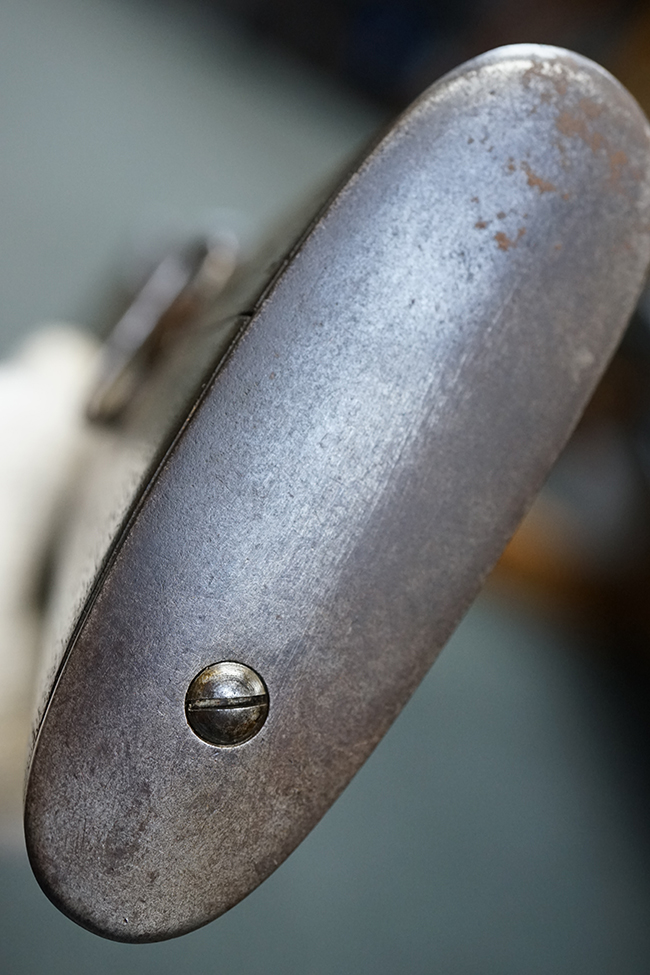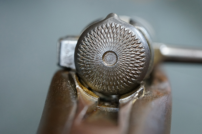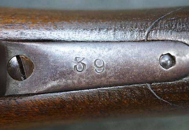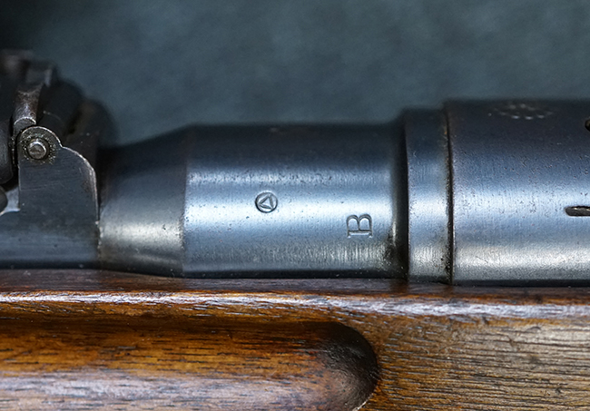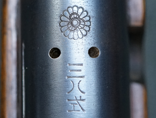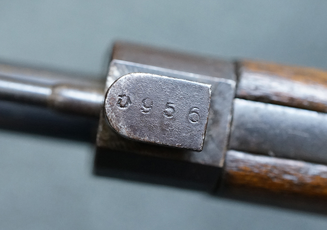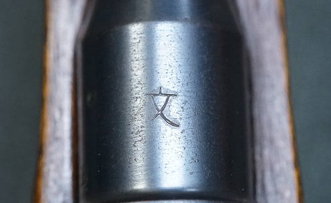 本品は三八式騎兵銃 初期型の東京砲兵工廠 (小石川) 製です。 東京砲兵工廠では1923年 (大正12年) の関東大震災により甚大な被害を受け、一部機能を残しその役目を小倉工廠に移すまで生産されました。 初期型の東京砲兵工廠 (小石川) 製は、非常に丁寧な仕上がりで、検査刻印が多数打刻されているのが特徴的です。 本品の機関部左側面にはシリアルNo.0084203に加えて東京砲兵工廠製を示す刻印が入っています。 尚、シリーズ刻印は入っていません。 薬室上面の菊花紋章には教練用として払い下げられたことを示す追加刻印が打たれています。 また、薬室上面にも教練用を示す「文」の追加刻印が見られます。 その他、上帯下部に「ひ956」、下支鉄に「39」の番号が入っています。