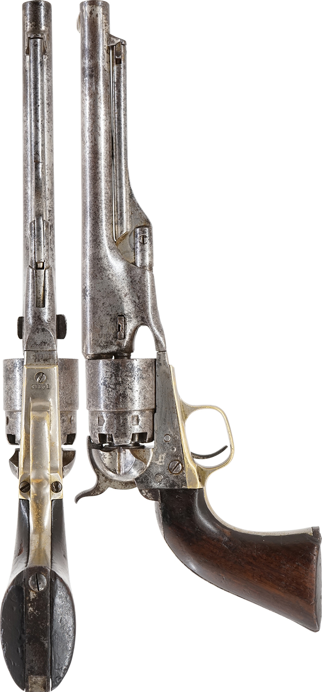 本品は全体に使い込まれて適度に時代が付いた良い雰囲気となっており、銃身やフレーム、シリンダーといった金属部は、全体に仕上げが落ちて白磨き仕上げのようになっており、やや時代錆や表面錆痕が見られる他、グリップ・フレーム下部にやや朽ち込みが見られますが、全体としては大きな欠損等は見られず、概ねしっかりとした状態が保たれています。 木製グリップについても使い込まれたコンディションとなっており、やや打ち傷や線傷の他、左右面の下部の角に欠けが見受けられますが、取り付け自体はがたつきもなくしっかりとしています。 真鍮製のトリガー・ガードについては、オリジナルの銀鍍金仕上げが比較的良好に残っています。 バレル・ウェッジの板バネ部分の抜け止めの突起に欠損が見受けられますが、ウェッジ自体は簡単に抜けてしまう事はありません。 銃身とフレームの固定については現状目立ったがたつきなどは見受けられません。 尚、シリンダーは前後に1,6mm程度の遊びが見られます。 作動については問題なく、ハンマーのハーフ・コック及びフル・コックもしっかりと掛かり、シリンダーも正常に回転します。 フル・コック位置でトリガーを引く事により、ハンマーがスムーズに力強く落ちます。 銃身内は若干の表面錆が見られるものの、ライフリングは比較的はっきりと残っており、銃口から薬室まで完全に抜けています。 シリンダーのパーカッション・ニップルについても大きな欠けや変形等は見受けられず、良好な状態が保たれています。 銃身下部のローディング・レバーの操作についても問題なく行う事が可能です。 ローディング・レバーは左右に若干の遊びが見られるものの、キャッチによる固定はしっかりと掛かります。