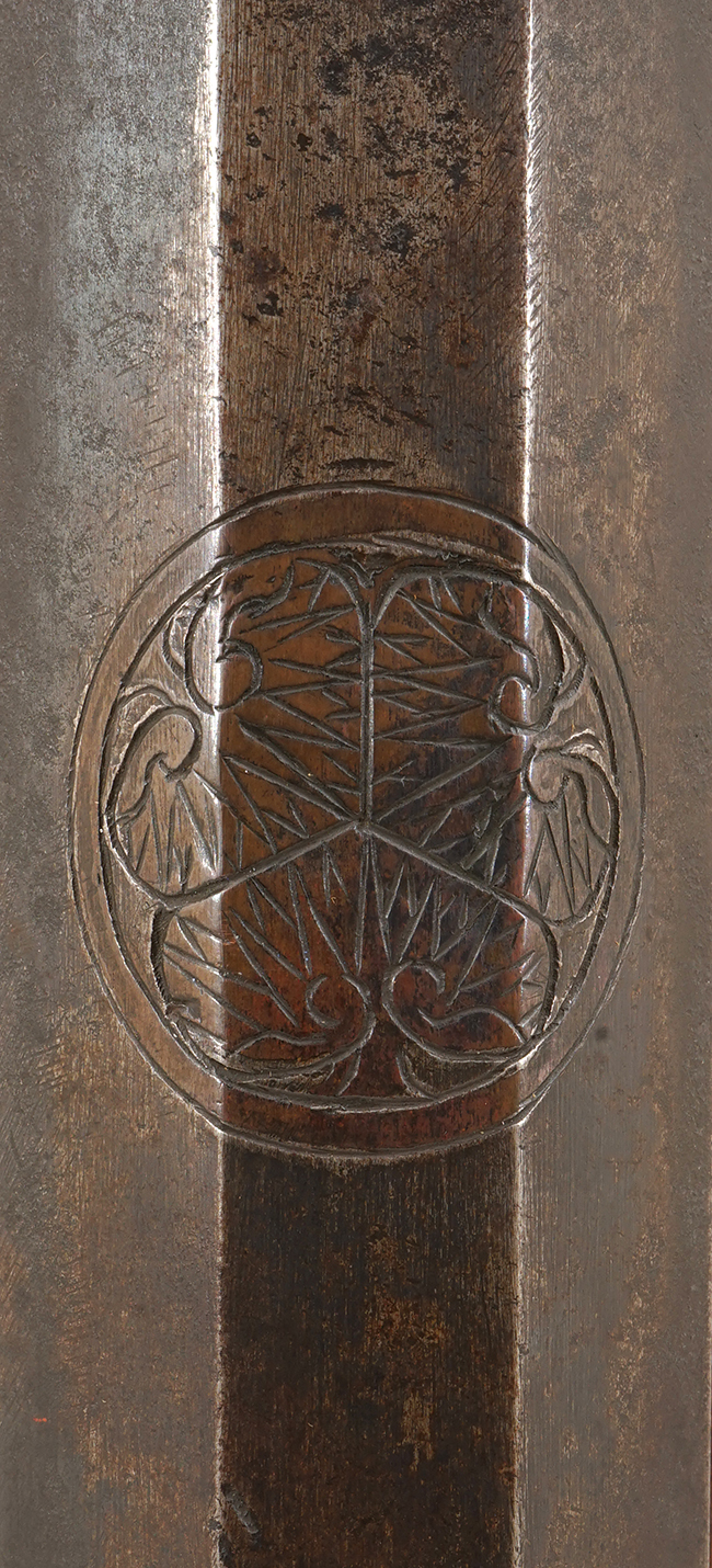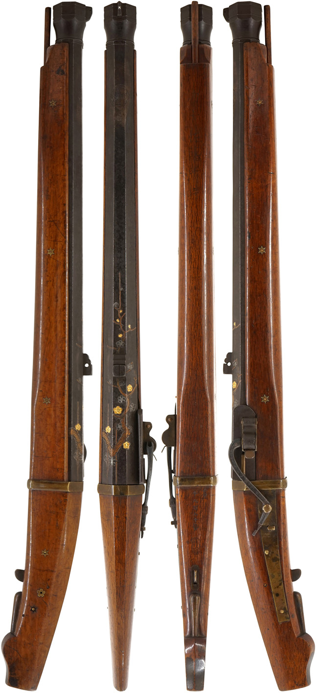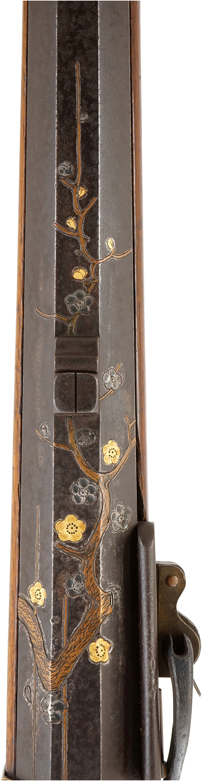 銃身上面には梅樹を高彫に見事に描いており、金銀銅を巧みに使った色絵象嵌で仕上げています。 銃身の上部前方には「丸ニ立ち葵紋」が施されています。