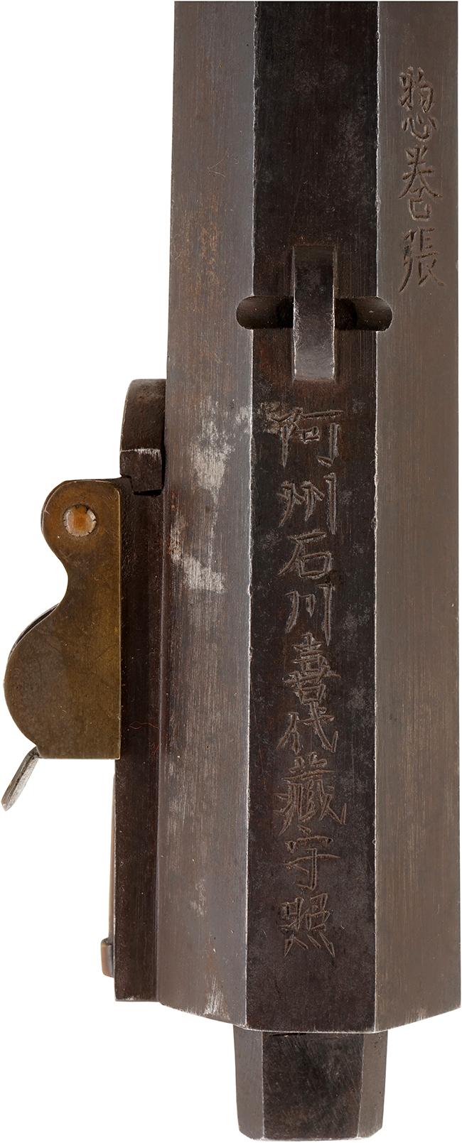 本品は在銘で、銃身下面には「惣巻張 阿州石川喜代藏守照)」の銘が切られています。 石川喜代藏守照は「全国鉄砲鍛冶銘鑑」P.17及び「全国鉄砲鍛冶銘地域別分類」P.300にも阿州住として掲載されている銃工です。 堂々と切られた銘は鏨(タガネ)の運び、勢いから真正の品です。(MM)