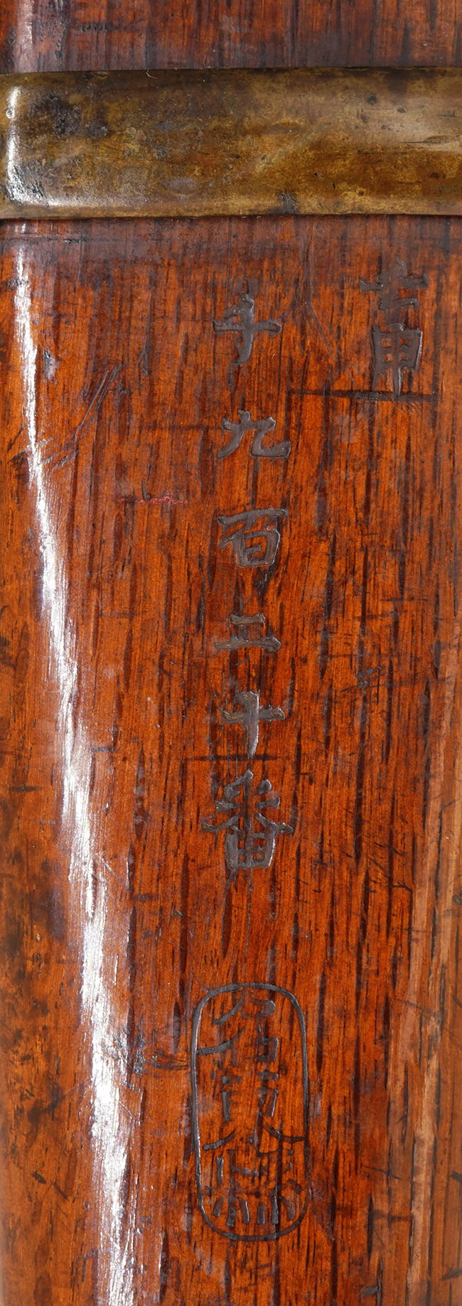 台 (銃床) は下面に「壬申 千九百二十番 名東縣」の刻印が入っています。 「壬申刻印」とは古式銃の一種の戸籍番号になります。 明治4年に明治陸軍は主力小銃の統一化を図る為、旧藩に残る銃砲の種類、挺数の把握が急務となりました。 翌明治5年 (1872年、壬申) 1月から、太政官布告第28号第五則の「銃砲取締規則」によって、私蔵されていた銃砲の「我が国初の管理統制」が始まりました。 廃藩時に旧藩は旧家臣に軍用銃を下付した事例が多く見られ、旧士族の家には一挺の軍用銃があったとも言われています。 それらの銃はその後市中に大量に出回り私蔵されていました。 銃砲取締規則ではこれらの私蔵されていた銃砲について、管轄庁 (東京と大阪は武庫司) に持参して改刻印式によって番号、官印を受ける (これが明治5年度であれば壬申刻印と番号) 事が義務付けられました。 同時に管轄庁は同人名と番号を管轄鎮台に届け出て、鎮台より武庫司にそれらが提出される仕組みになっていました。 この調査は明治20年代頃まで銃砲調査が行われましたが、明治5年 (1872年=壬申) の調査が最も大々的に行われ、今日この種類の刻印の内90-95%が壬申の年に行われた事から、古式銃に打たれた漢字の刻印をまとめて「壬申刻印」と呼ばれています。