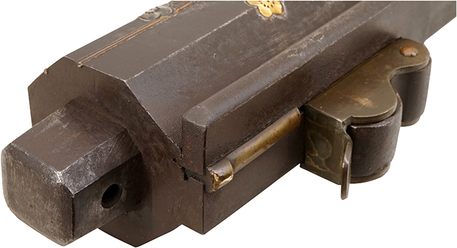 引金の後方にはナマコ金が設けられています。 火挟は鉄製です。 徳島城博物館の企画展「阿波の鉄砲~鉄砲からみた阿波史」の図録にも同様の形状の中筒が掲載されていました。 徳島藩の砲術、流派が他国と違うのでしょう。 この特殊な形状の中筒が使われていたようです。 筒 (銃身) は八角銃身で、柑子も八角となっており、また銃身は肉厚で一見二十匁以上の大きさがあるように見えますが、実際の口径は19mmで十匁です。 阿波中筒の掟通りです。 元目当ても阿波中筒で見られる典型的な「片透かし」です。 目釘穴の飾り金具は阿波の特徴でもある六星で合計8カ所揃っています。 当然作者は阿波の鉄砲鍛冶です。 本品は阿波中筒の掟を全て押さえており、更にこれからの研究が必要な特殊な台かぶを備えた興味ある一挺です。