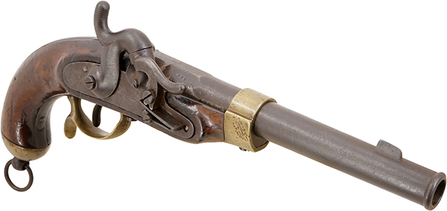 M1850 騎兵拳銃は帝政ドイツのプロイセン王国で1850年に制式採用された騎兵用の大口径(15mm)の単発管打ち式軍用拳銃です。 8.5インチのテーパーが付いたスムース・ボアのラウンド・バレルに銃口がキャノン・バレルと呼ばれるマズル・クラウン部分にリブ補強の付いた当時のプロイセン王国軍用拳銃独特のものです。 同時期に制式となった6連発紙薬莢を使用するニードル・ファイアのドライゼ拳銃と比べると非常にオールド・ファッションな形式の拳銃です。 しかしながら、軍用拳銃として不可欠な信頼性と大口径なのが騎兵隊員には喜ばれました。 当時騎兵はサーベルや槍を主武装とし、拳銃はあくまでも補助用として使用されました。プロイセン騎兵隊は軍馬のサドルの両サイドに付けたサドル・ホルスター(pommel holsters)に一丁ずつ計二丁の本銃を装備しました。 本銃の特徴はハンマーの前にフリントロックの様なセーフティ部品が付いており、暴発を防止するのと、パーカッション・キャップが脱落するのを防ぎました。 そのように単発でも信頼性があって威力のある本銃が軍用として用いられたのも頷けます。M1850 騎兵拳銃は普仏戦争(1870年)でも主要騎兵用拳銃として使用されました。 M1850 騎兵拳銃が第一線を退いたのは1879年に金属薬莢(センター・ファイア)を用いるダブル・アクション 6連発の「M1879 Reichsrevolver」が採用されるまで続きました。 M1850 騎兵拳銃はPotsdamとSaarnにあった王立造兵廠の他にValentin Christian Schilling (V.C.S.)社、Spangenberg & Company (S&C)社、Spangenberg & Sauer (SP&SR)社などの民間の銃砲メーカーでも製造されました。 Saarn王立造兵廠では1851年から1862年まで生産され、Erfurtに移転してからはM1850 騎兵拳銃は生産されませんでした。 1862年以降は本銃の生産所であるPosdam造兵廠が唯一の王立造兵廠となりました。ドイツ語でHusarenpistole (軽騎兵用拳銃) と呼ばれる、騎兵用官給品で当時の列強の騎兵拳銃とも共通する大口径 (15mm) の単発管打式軍用拳銃になっています。(MM)