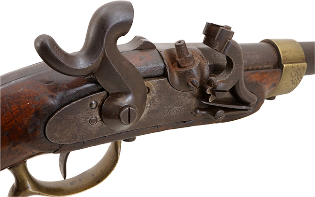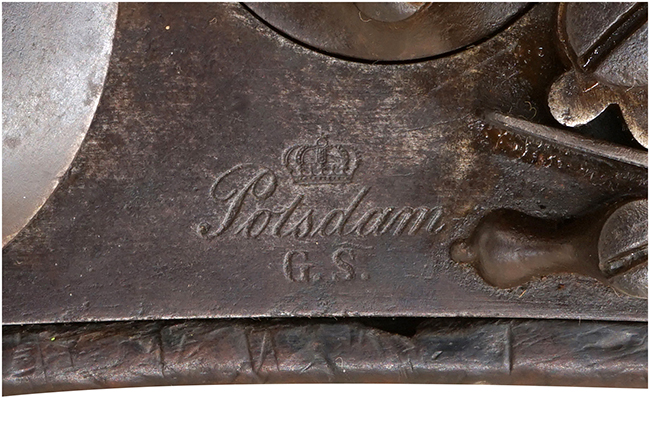 ロック・プレートにはPotsdam王立造兵廠製を表す「Potsdam, G.S.」の刻印が見られ、銃身左上面には製造年を示す「1851」の刻印があります。 また、銃身右上面には「1866」の刻印も見られます。これらの刻印から本品は1851年Potsdam王立造兵廠製で、1866年にオーバーホールされた事を示しています。