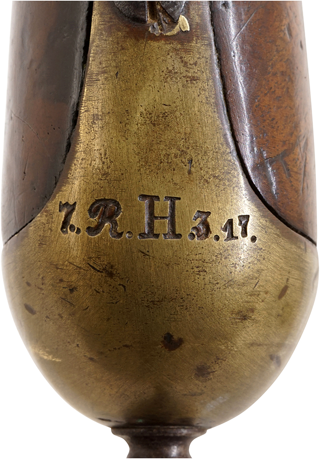 本品は帝政ドイツのプロイセン王国ラインラント軽騎兵第7連隊第3中隊の第17番目の装備銃として使用された品です。 真鍮製のトリガー・ガードに打たれた「7.R.H.3.17.」の刻印がそれを明確に表しています。「H 」は軽騎兵(Husaren)、「K」は重騎兵(Kuerassieren)、「U」は槍騎兵(Uhlan) を表しますので、本品はプロイセン陸軍内でもエリートである騎兵連隊でも特に伝統があるドイツ皇帝「Koenig WILLIAM I」の名前を冠したプロイセン王国ラインラント軽騎兵第七連隊「7.R.H」が使用した事を物語っています。 その後の「3」は中隊番号で、「17」は中隊の中での番号です。 銃身の裏側(木部で隠れている部分)とサイド・ロック・裏側にはシリアル No.の「SO 471」が、そして多くの部品に「15」の通し番号が入っています。 また、銃身裏側には「HM」の刻印が見られます。