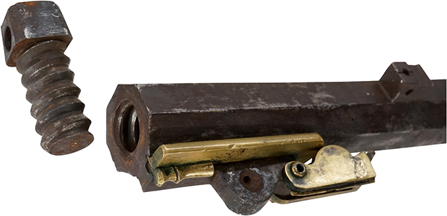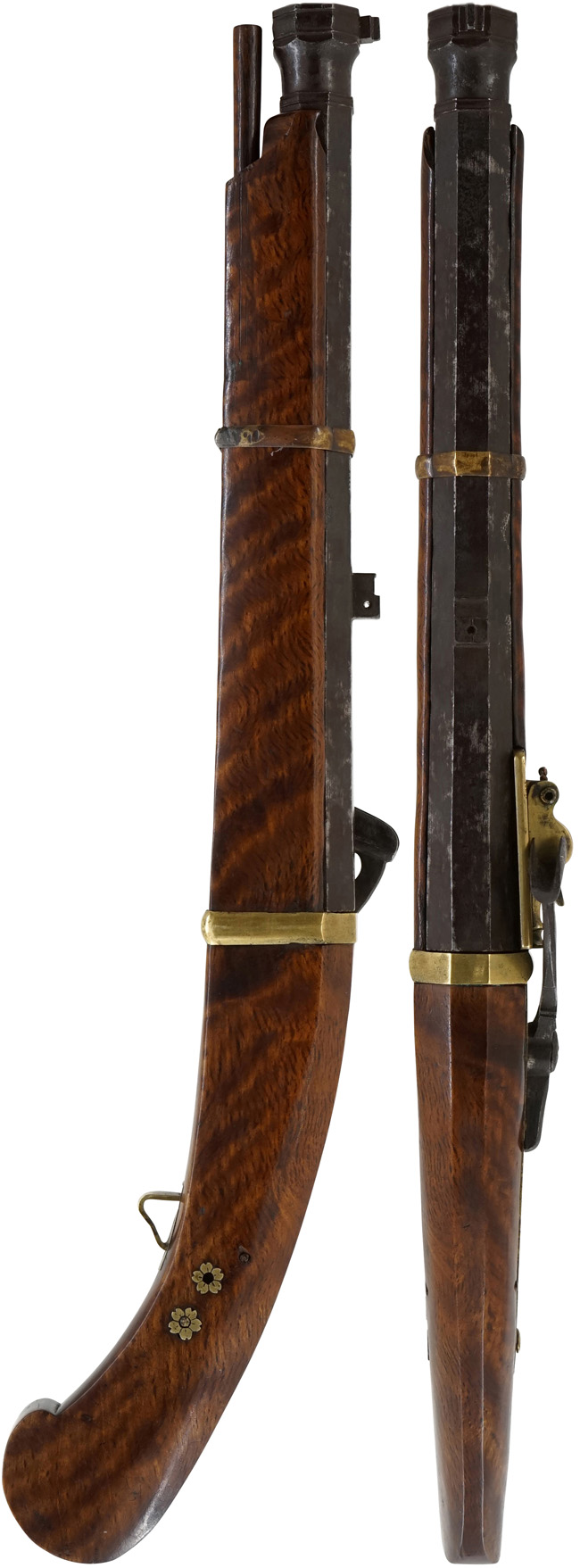 カラクリの作動については完全で、火挟を起こした際のロックはしっかりと掛かり、引金を引くと火挟がスムーズに落ちます。 銃身内は銃口から銃身後部まで抜けて (通って) おり、火穴も抜けています。 尾栓の着脱も問題ありません。 本歌の木製カルカ (さく杖) が付属致します。