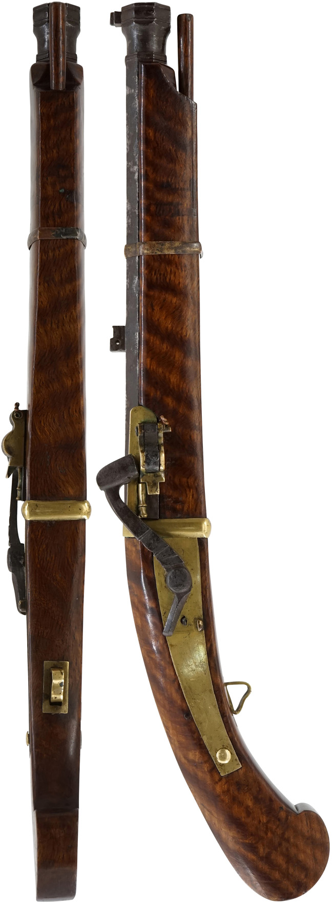 台木 (銃床) 全体としては傷の少ないしっかりとした強度が保たれており、艶があり、縞模様がでた当時の仕上げも大部分に残った良い状態です。 カラクリの地板や胴金、雨覆、火蓋、用心金といった真鍮部品については、僅かに磨かれている箇所が見られますが、大きな違和感は感じられず、全体としては適度な時代が付いた良い雰囲気となっています。 用心金など各部の取り付けは現状がたつきも見られずしっかりとしています。