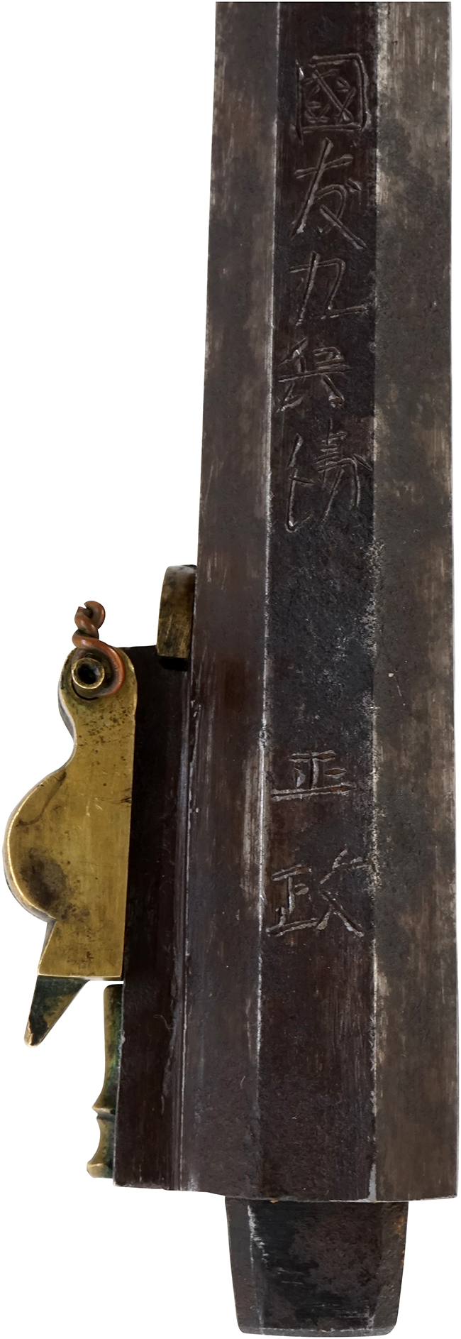 本品は典型的な馬上筒でとても均整のとれた美しい形状をしています。 在銘で、銃身下面に「國友九兵衛正政」の銘が切られています。 「國友九兵衛正政」まで全てハッキリと読めます。 「國友九兵衛正政」は江州 (近江国) 国友の鉄砲鍛冶で、「全国鉄砲鍛冶銘鑑」P.105及び「全国鉄砲鍛冶銘地域別分類」P.97にも江州住として掲載されています。「九兵衛家」は江戸初期(元和年間-1615年~1624年)から明治にかけて活躍した鍛冶師の名家で本名は「宮下九兵衛」です。江州住國友九兵衛の確認できる在銘品で最も古いのは元和三年間(1618年)の年紀が入った品が現存しています。「國友九兵衛家」は「延寿」「景清」「勝正」「清光」「恭信」「恭峯」「重成」「重正」「重當」「重久」「直行」「正政」「正知」「光重」「泰峯」「行義」「吉寿」「緑寿」の鍛冶が名鑑に載っています。 「正政」は江戸時代中期から後期頃の鍛冶だったのではないでしょうか。