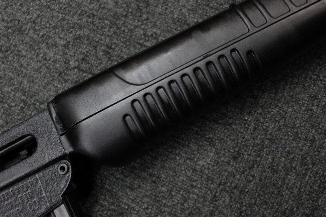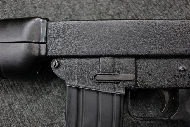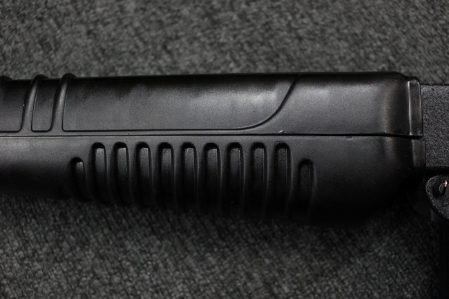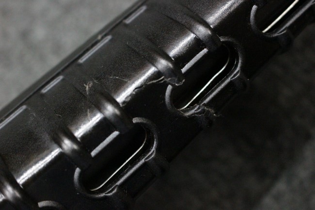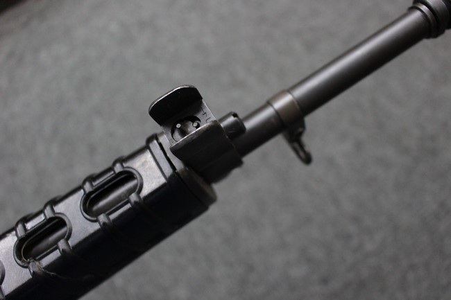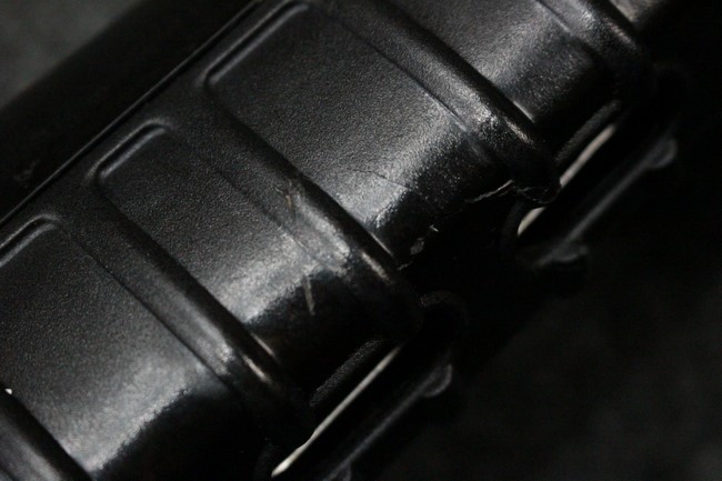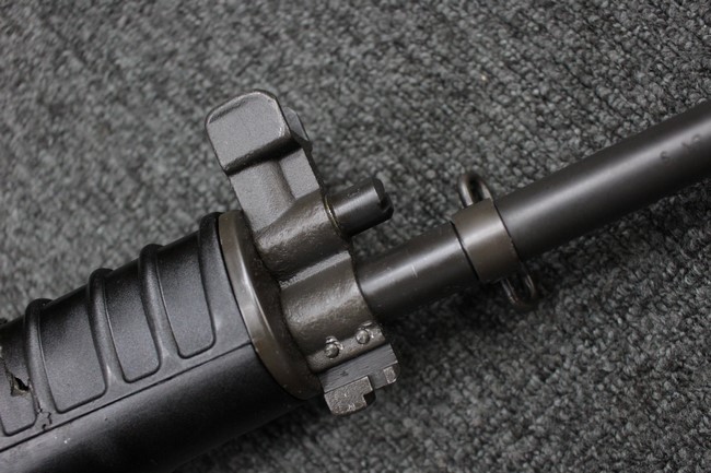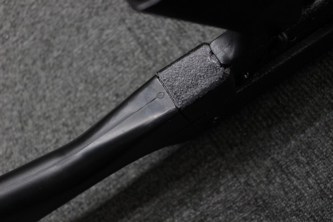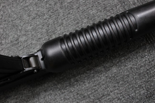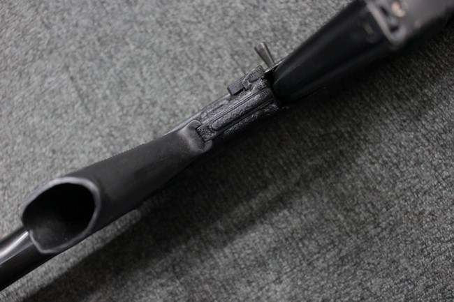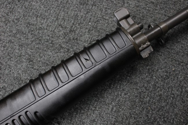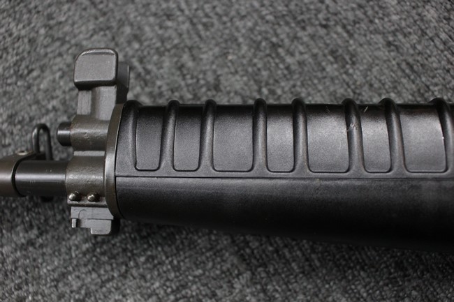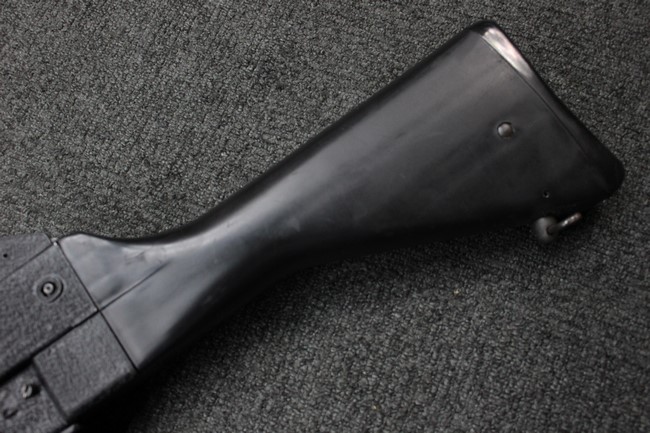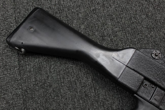 本品は全体に使用感も比較的少なく、SAR80の特徴であるスターリング短機関銃と同様のレシーバーのシボ塗装についても剥落等は最小限となっています。 アッパー・ハンド・ガードの前方右側面には脱落等は無いものの何かに当たったと思われるクラックが見られます。 しかしグリップ、バット・ストックといった他の樹脂部は保管上の若干の小傷や擦れ等は見受けられるものの、こちらは目立った欠損等は見受けられず、総じて良好な状態が保たれています。 ゴム製のバット・プレートについても若干の擦れを除いて目立った経年劣化等は見受けられません。