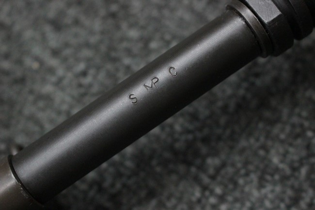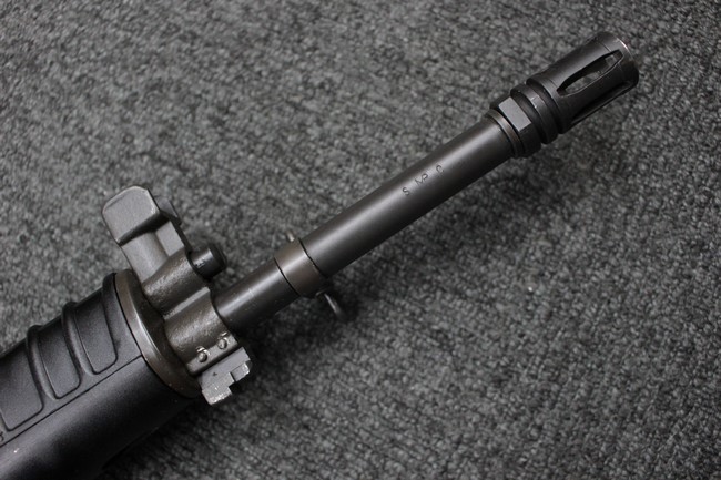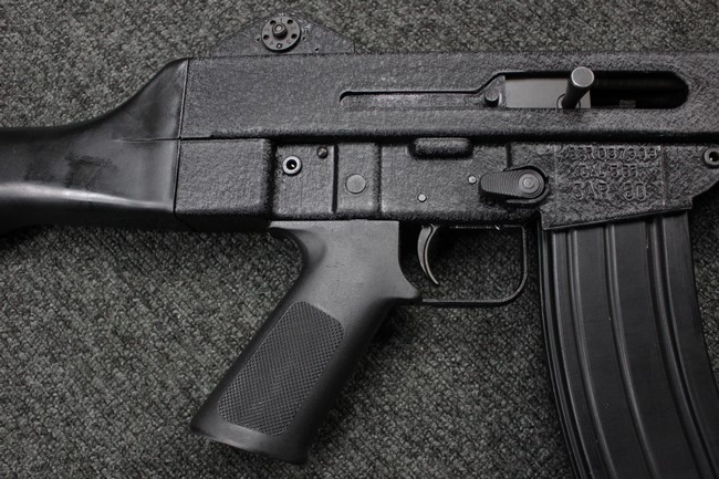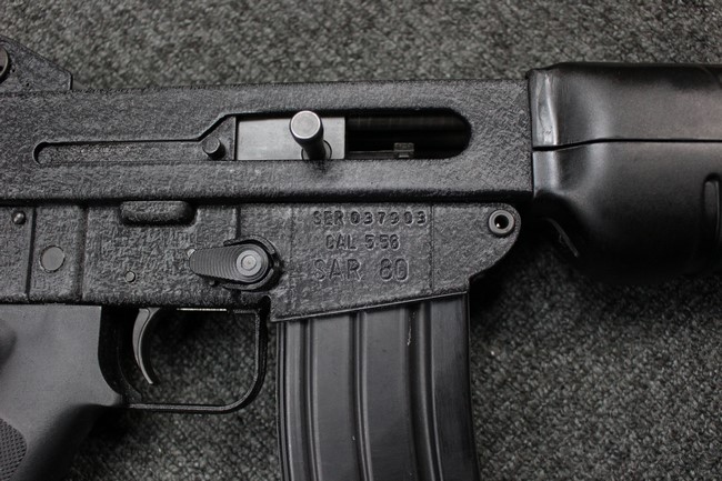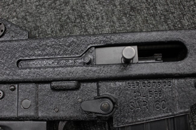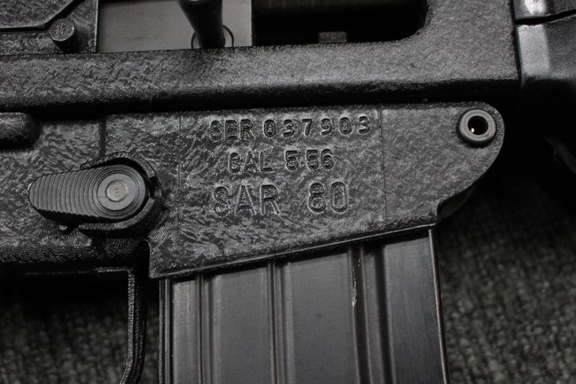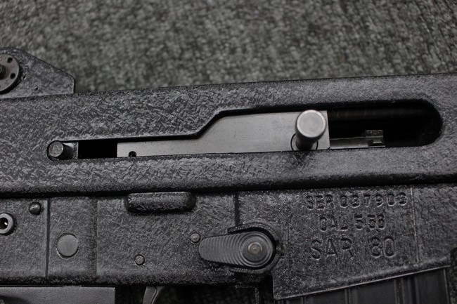 本品のマガジン・ハウジング右側面にはシリアルNo.037903に加えて「CAL.5.56 SAR80」のモデル名刻印が入っています。 本品はレシーバー上面にスコープ・マウント・ベースが装備されていないタイプです。