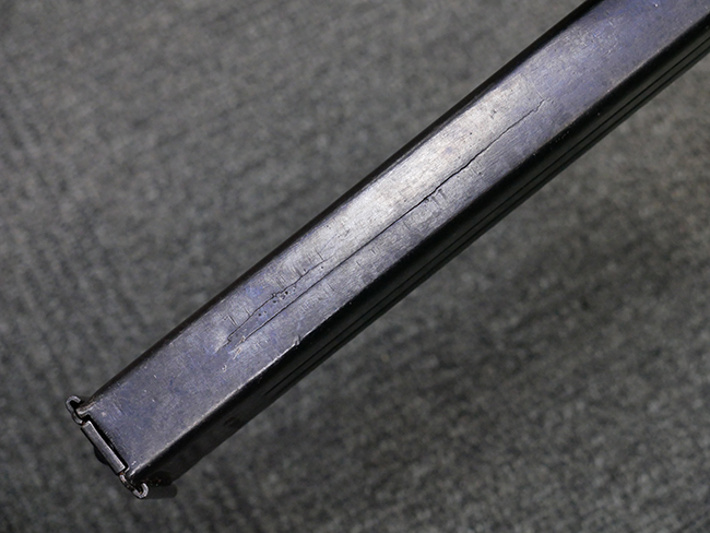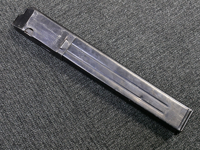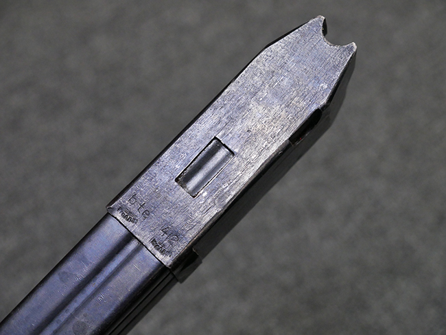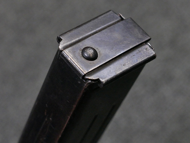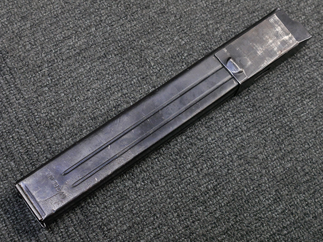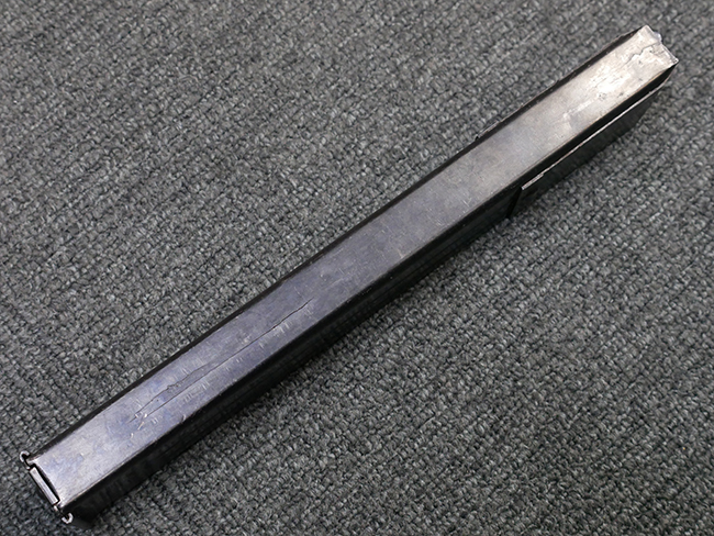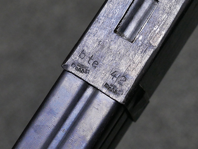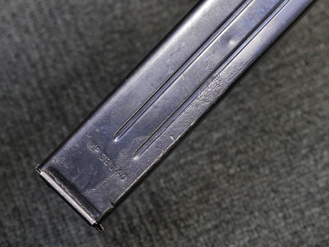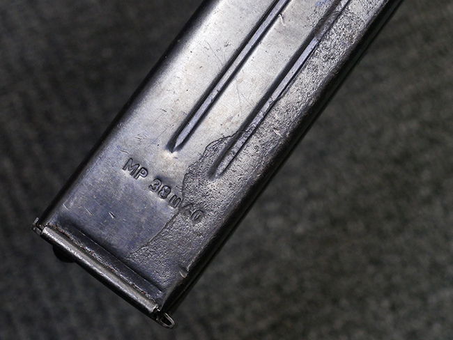 マガジンの着脱やリア・サイトの起倒については問題なく行う事が可能です。 付属のマガジンには「M.P.38 u 40」及び1942年Frank'sche Eisenwerke AG社製を示す「bte 42」の刻印が入っています。 マガジンについてもやや使用感が見受けられ、打ち傷や擦れ、経年による褪色の他、やや表面錆痕や一部に凹みが見受けられるものの、大きな破損等は見られず、概ねしっかりとした状態が保たれています。 尚、マガジン・スプリングは入っています。 マガジンは装着時に前後にやや遊びが見られるものの、固定自体はしっかりとしています。