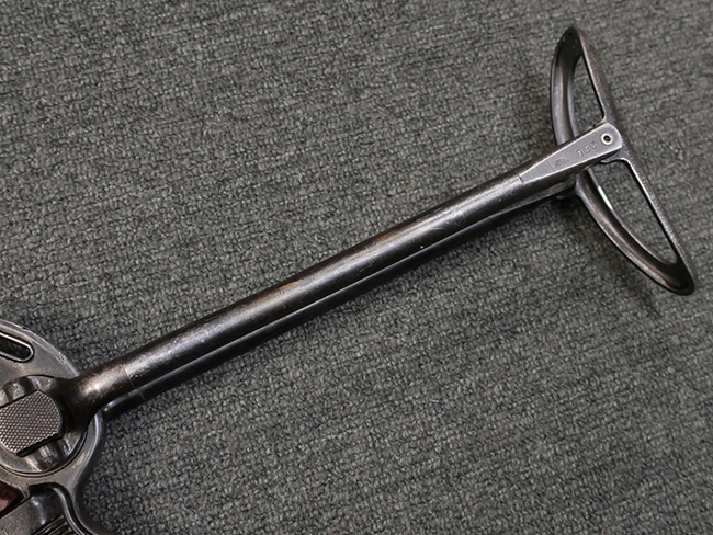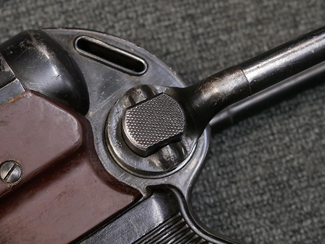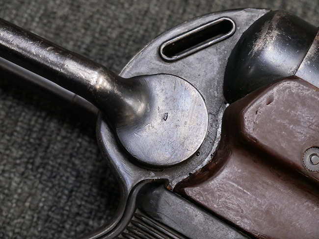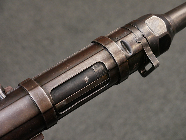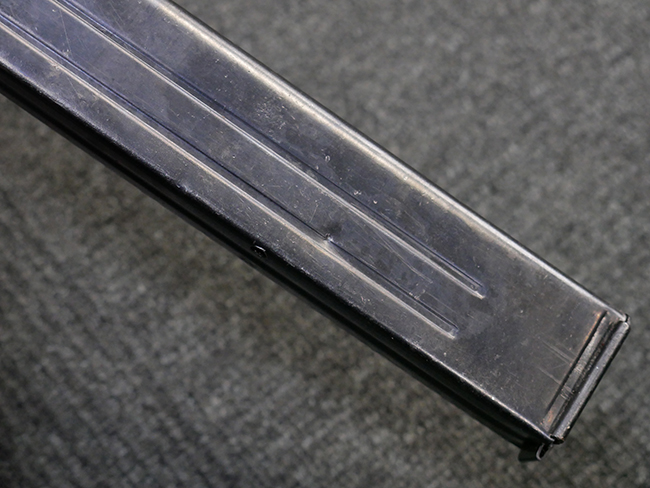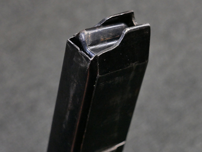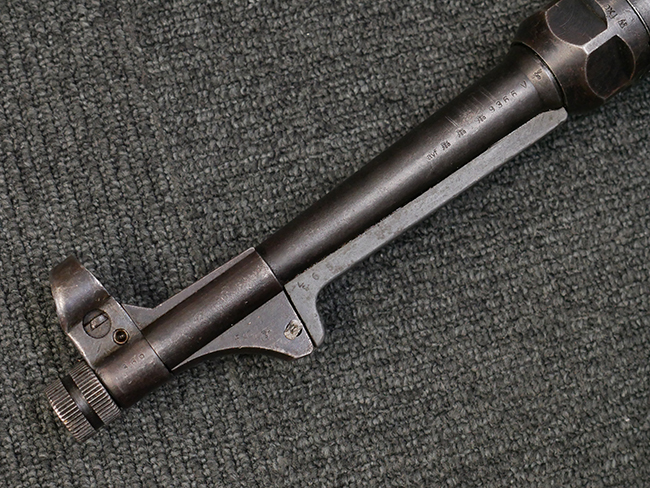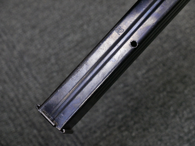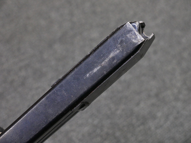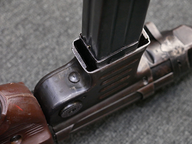 マガジンの着脱やリア・サイトの起倒については問題なく行う事が可能です。 付属のマガジンには「M.P.38 u 40」及び1942年Frank'sche Eisenwerke AG社製を示す「bte 42」の刻印が入っています。 マガジンについてもやや使用感が見受けられ、打ち傷や擦れ、経年による褪色の他、やや表面錆痕や一部に凹みが見受けられるものの、大きな破損等は見られず、概ねしっかりとした状態が保たれています。 尚、マガジン・スプリングは入っています。 マガジンは装着時に前後にやや遊びが見られるものの、固定自体はしっかりとしています。