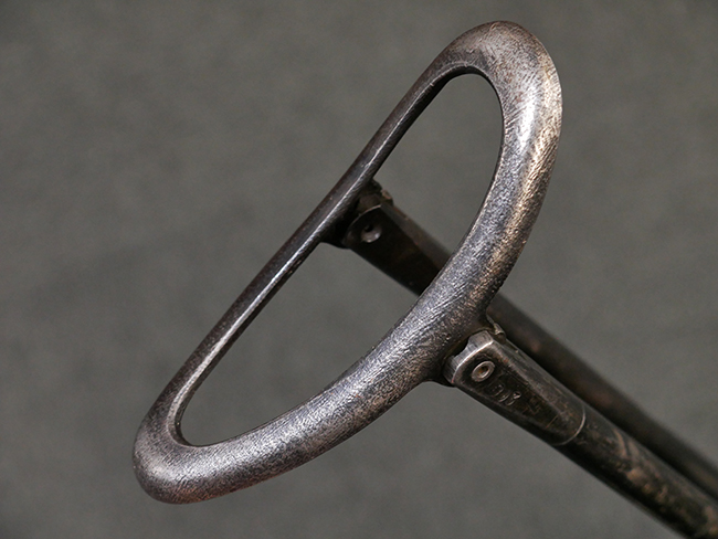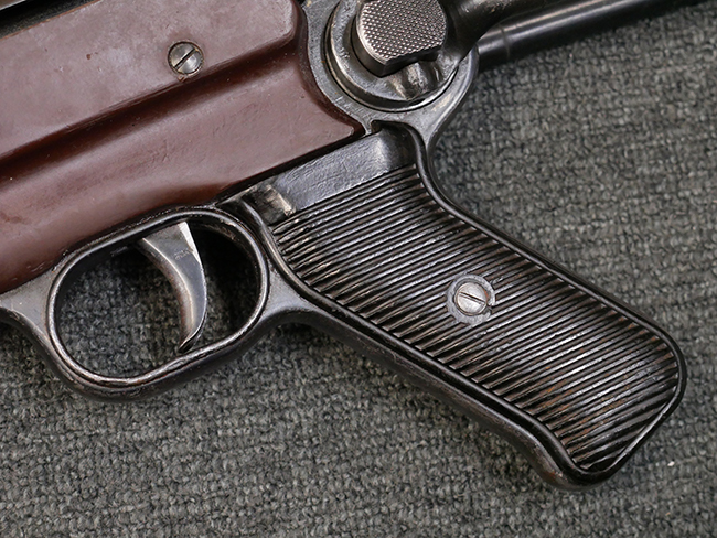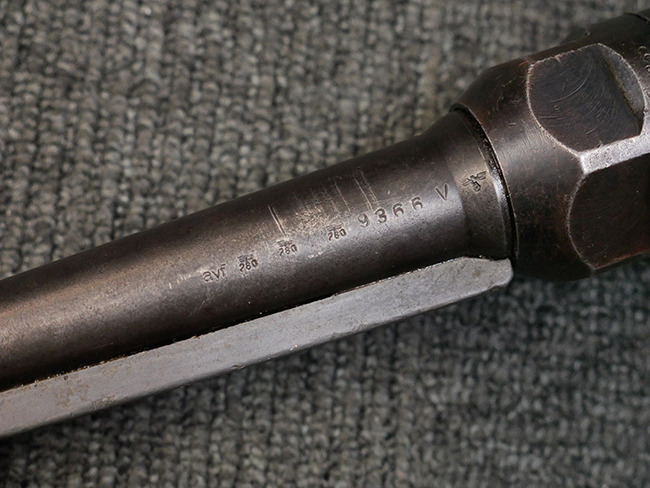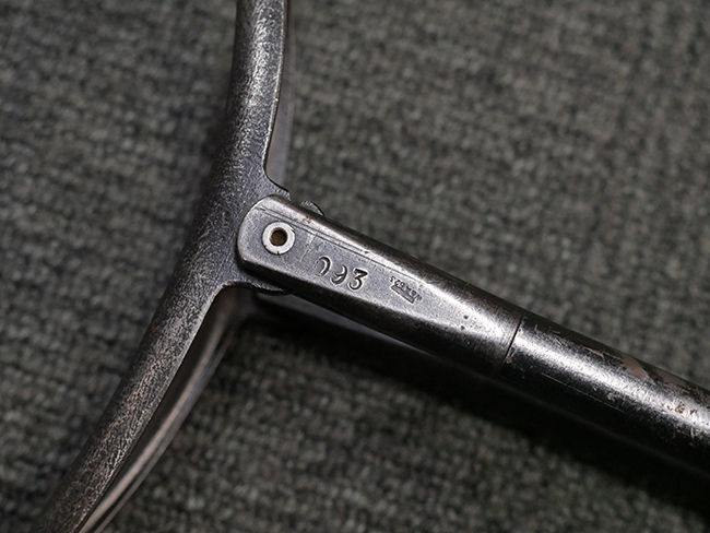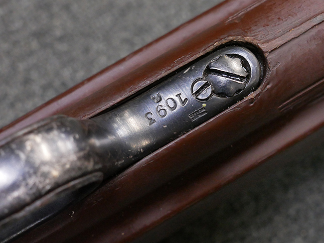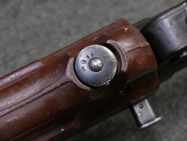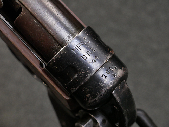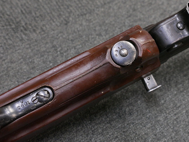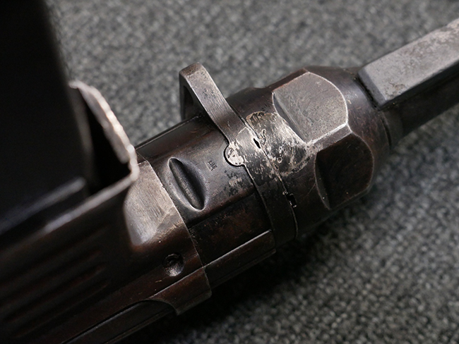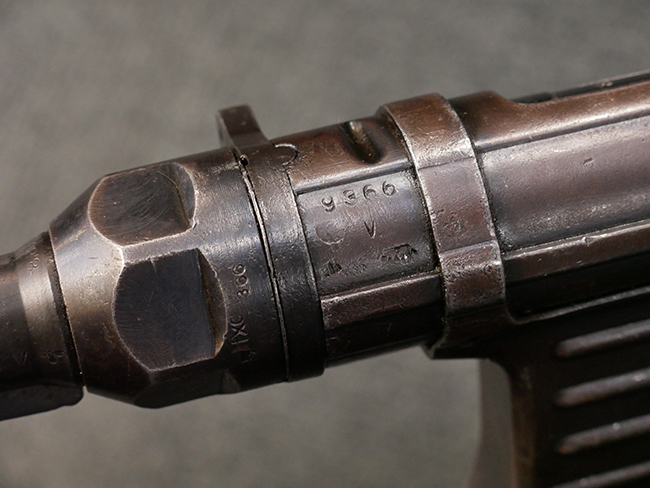 本品のレシーバー・エンド・キャップ上面には「MP40」のモデル名に加えて、1941年ステアー社製を示す「bnz 41」の刻印が入っています。 アッパー・レシーバーのシリアルNo.は9366、ロア・レシーバーは1093となっています。 バレル・ナットの形状は六角型となっており、シリアルNo.はアッパー・レシーバーとマッチした366となっています。 尚、バレル・ナットにC.G.ハーネル社製を示す「fxo」の刻印が入っている事から、アッパー・レシーバーもC.G.ハーネル社製である事が窺えます。 グリップ・フレームは前後二分割でプレス成型したものを溶接で組み合わせて製造されたタイプで、シリアルNo.はロア・レシーバーと一致した1093となっています。 尚、バレル・レストは合金製となっています。 各部のシリアルNo.は、銃身、フロント・サイト・ガード及びリア・サイトがアッパー・レシーバーと一致した(9)366、折り畳みストックがロア・レシーバーと一致した093となっており、レシーバー・ロック・スクリューが394となっています。 その他、各部にアムト刻印が確認出来ます。