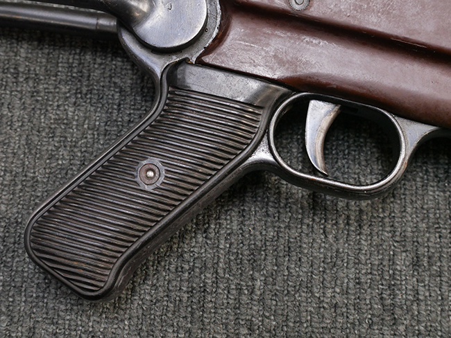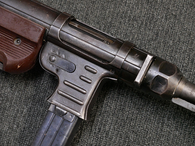1943~1944年頃にステアー社で製造されたMP40短機関銃の最終型では、レシーバー・エンド・キャップとロア・レシーバーをプレスにより一体成型しているのが特徴です。 このタイプでは、プレスにより鋼板を折り込む方法でロア・レシーバー全体を成形しており、エンド・キャップ上面からロア・レシーバーの外縁部にかけて補強板のように見える板状の継ぎ目が見られます。 バレル・レストは1943年にエルマ社で製造されたタイプと同様にプレス製となっています。