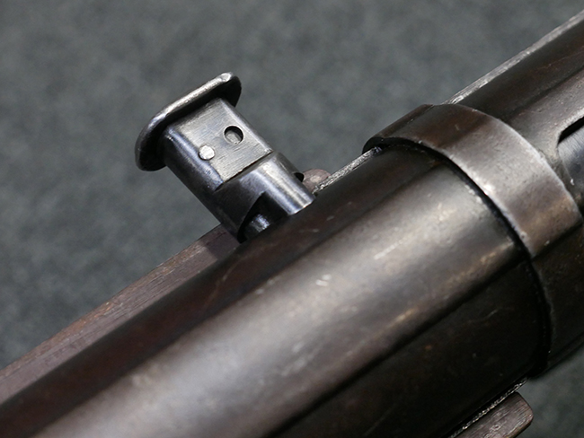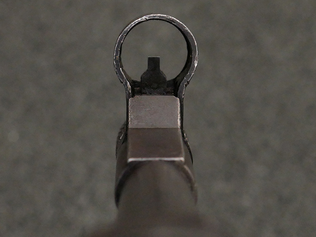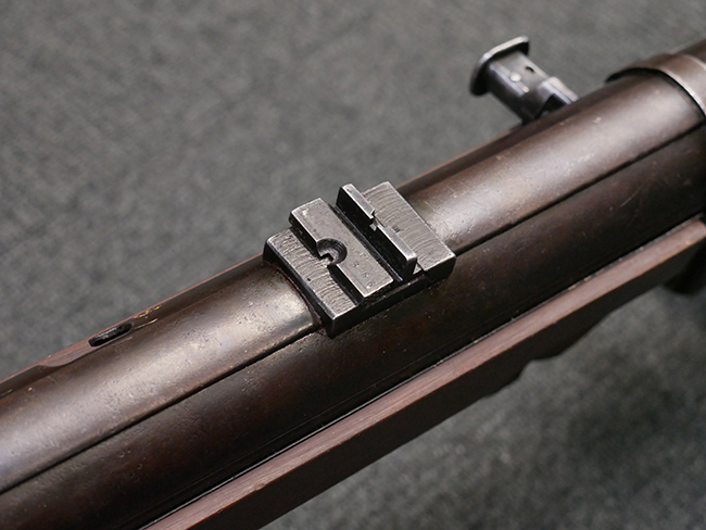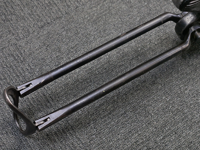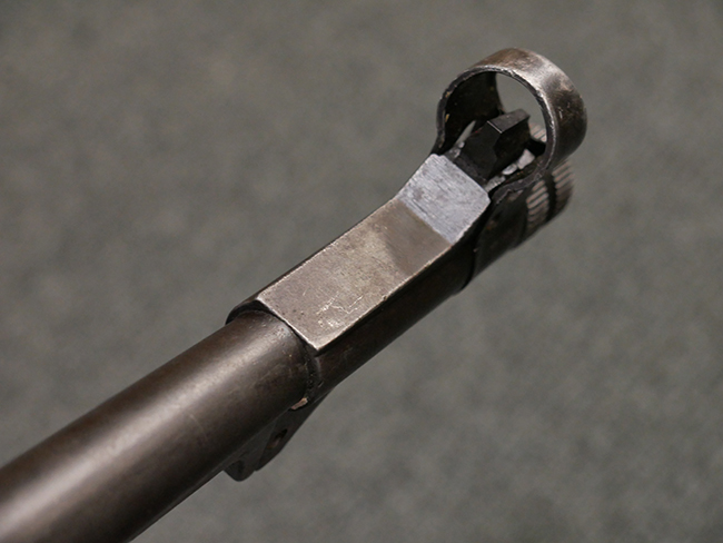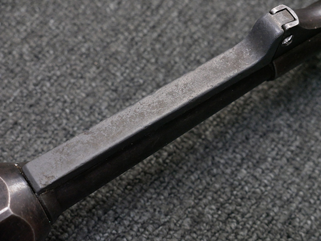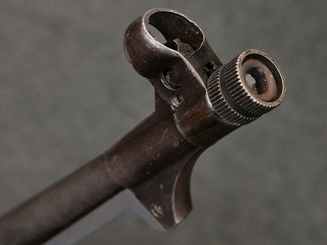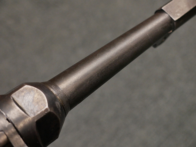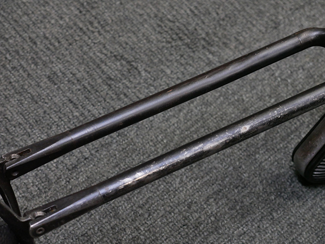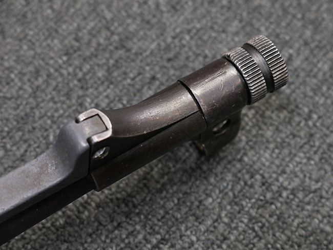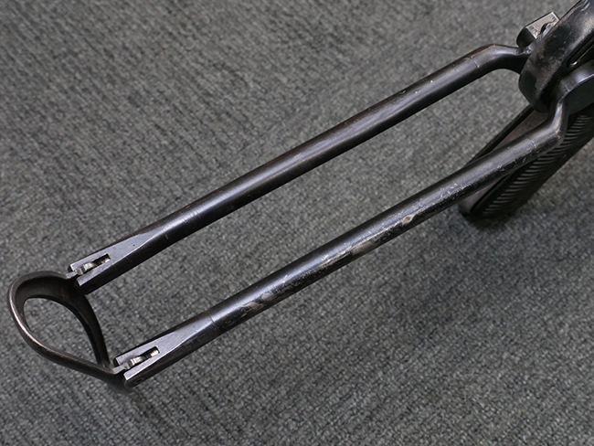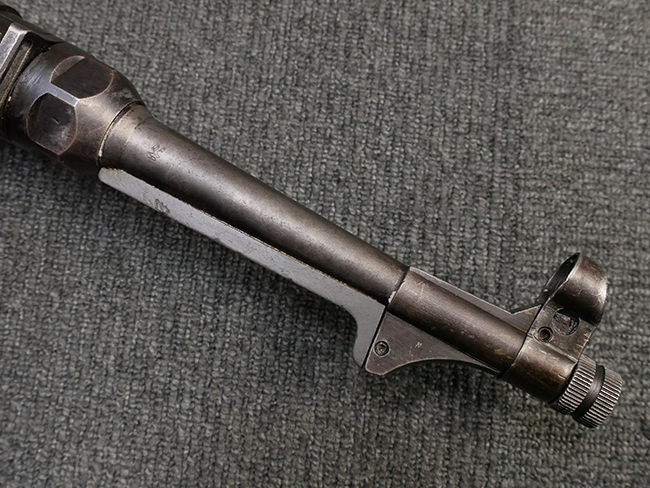 本品は全体に使い込まれたコンディションとなっており、各部で金属部の仕上げや色合いに違いが見られます。 金属部は打ち傷や擦れ、経年による褪色の他、やや表面錆痕や朽ち込み痕が見られますが、目立った破損や欠損等は見受けられず、概ねしっかりとした状態が保たれています。 排莢孔やロア・フレーム後部、グリップ下部等に若干の変形や凹みが見られますが、あまり気にならないレベルのものです。 ロア・フレームやストックといった金属部は、やや仕上げが落ちて金属の地肌が表れている箇所が見受けられます。 ベークライト製のハンドガードは、赤茶色の色味が強いものとなっており、打ち傷や線傷等が見られますが、現状大きな破損等は見受けられません。 グリップ・パネルは左右共に黒色の樹脂製で、こちらもやや打ち傷や若干の摩耗が見られるものの、現状目立った割れや欠け等は見られません。 尚、グリップ・パネルのグリップ・フレームへの取り付けについては、前後にやや遊びが目立ちます。 折り畳み式ストックについても、折り畳み時及び展開時にやや遊びが見られるものの、ロック自体はしっかりと掛かります。 アッパー・レシーバーとロア・レシーバーの取り付けについては、若干の遊びが見られますが、概ね許容レベルです。