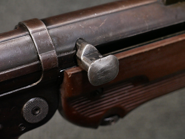 MP38ではレシーバーを無垢の鉄材からの削り出しで製作していた他、グリップ・フレームが鋳造アルミ合金製でしたが、MP40では生産性を向上させるためにレシーバー及びグリップ・フレームに鋼板プレス加工を採用しました。 これにより製造工程が簡略化された他、ドイツ国内で調達が難しかったアルミニウムの節約にも繋がりました。 また、MP38ではマガジンに弾薬を装填した状態で銃を後部から落下させた際に、ボルトが前進位置から跳ね上がって暴発する危険性がありましたが、1940年後半にドイツの銃器設計者ヒューゴ・シュマイザーによってコッキング・ハンドルを内側に押し込む事によりボルトを閉鎖位置で固定するフォワード・ロック・セーフティが開発されました。 このセーフティ機能を備えた新たな2ピース型のコッキング・ハンドルは、1942年半ば以降に製造されたMP40から本格的に装備されるようになりました。