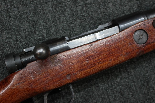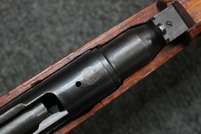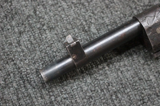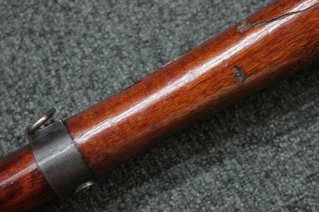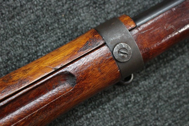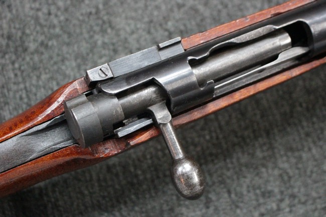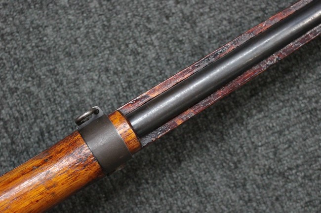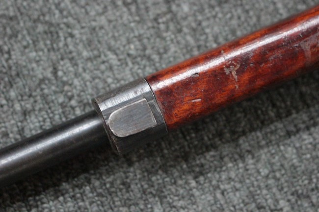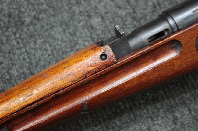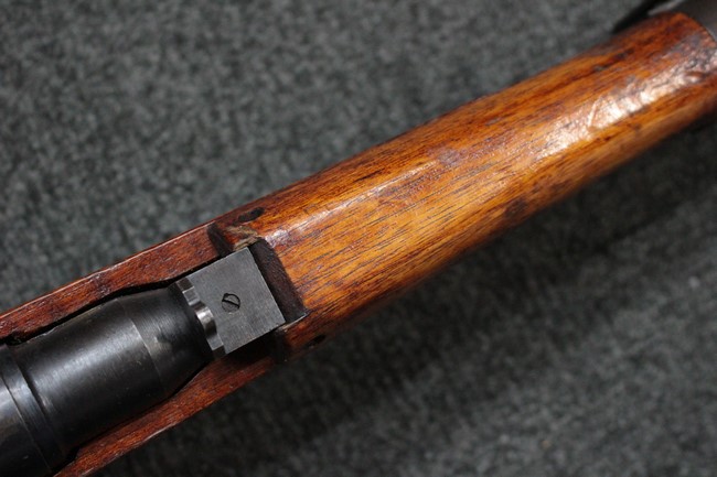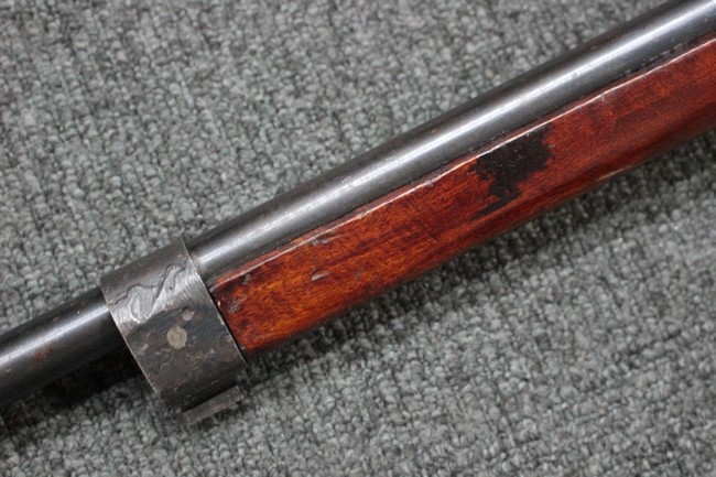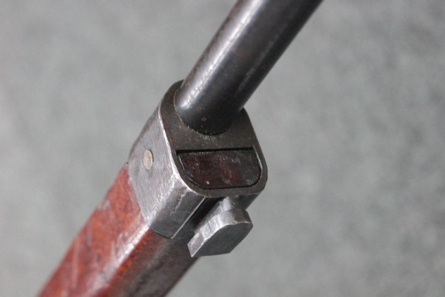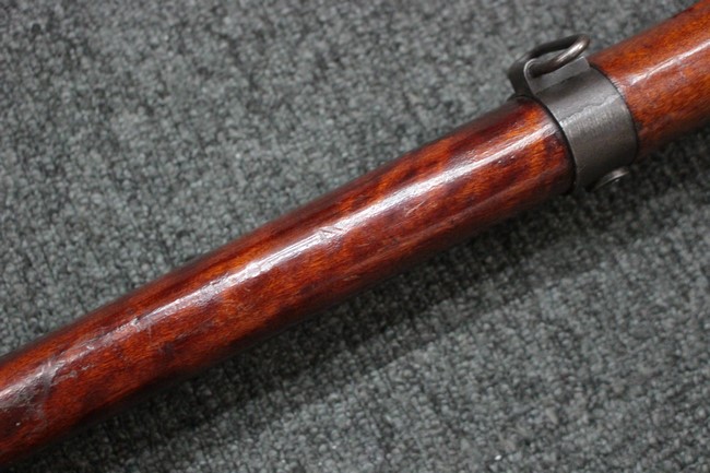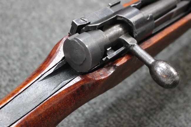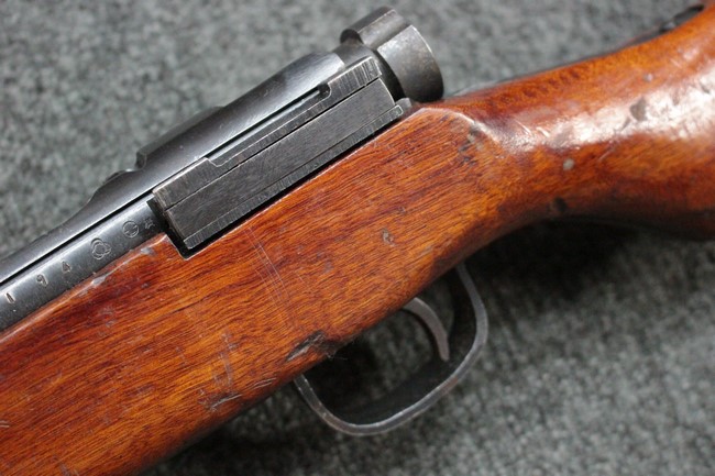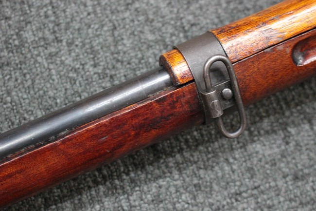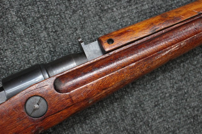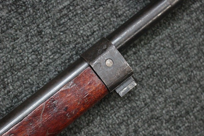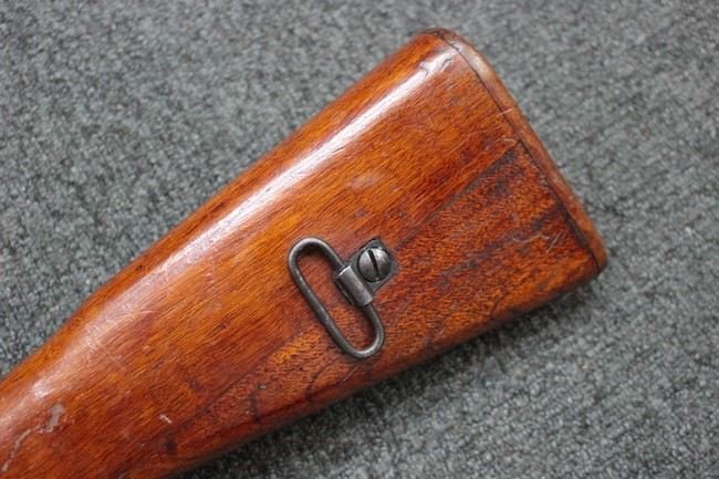 槓桿 (ボルト・ハンドル) は丸く、安全子は溶接痕の有るタイプとなっています。 照星(フロント・サイト)ガードが無い仕様で銃床が下帯部(センター・バンド)で分離式となっています。 また木被(アッパー・ハンド・ガード)が下帯までの短縮型で床尾板(バット・プレート)は木製 、上帯(フロント・バンド)は銃身に固定されており下帯には単脚取付基部が無く、さく杖は取付できない仕様となっています。 床尾負革止(リア・スイベル)はネジ1つで留めるタイプです。