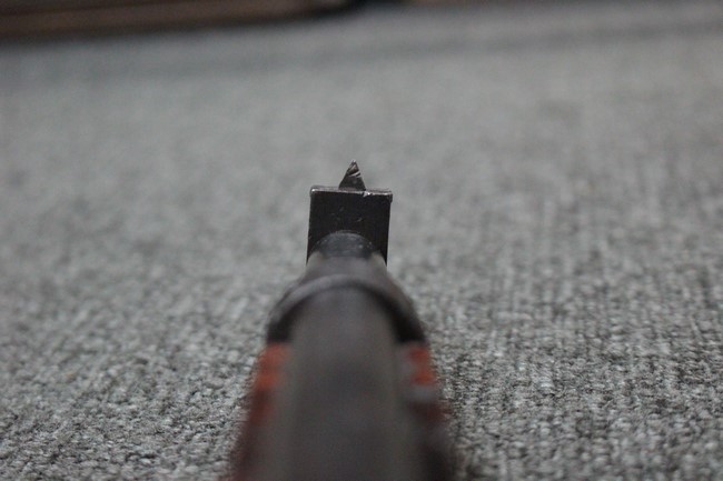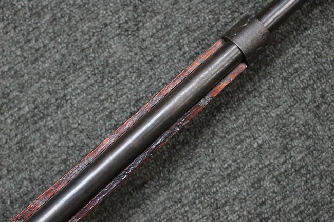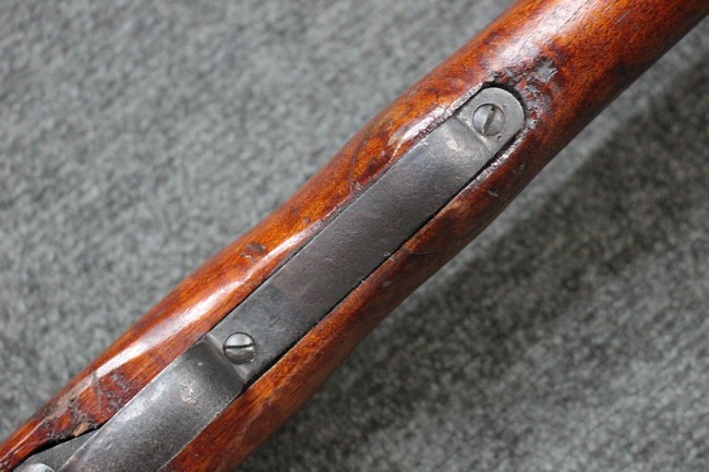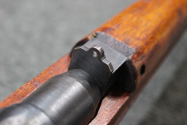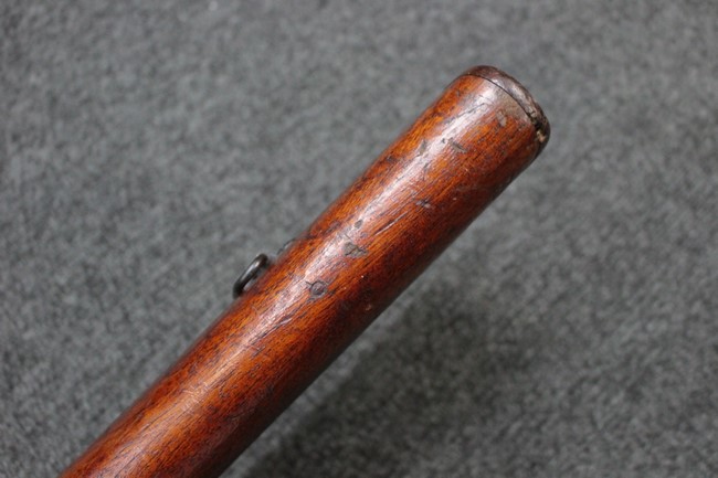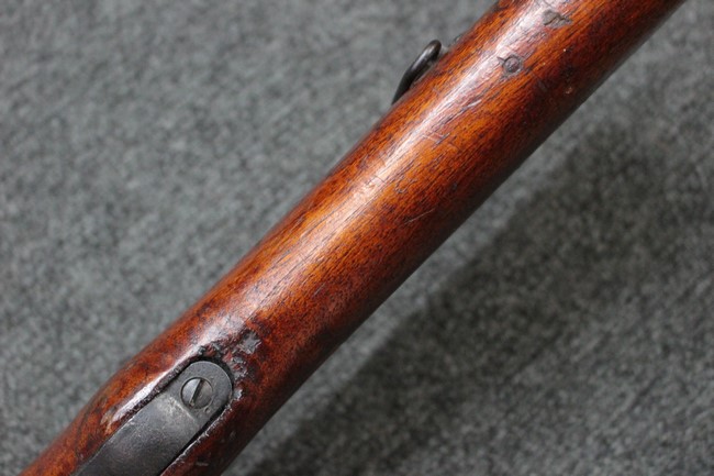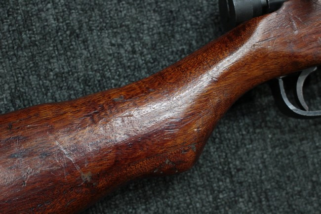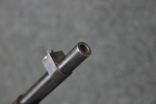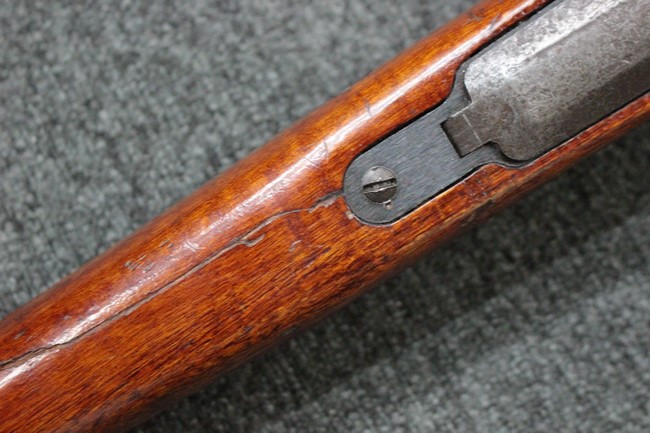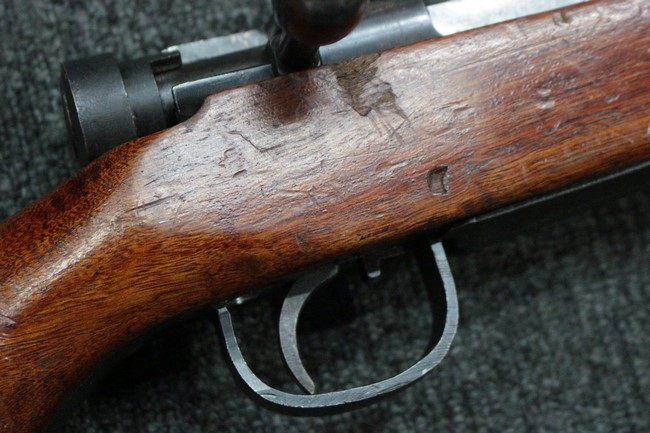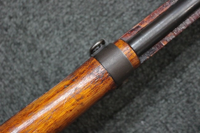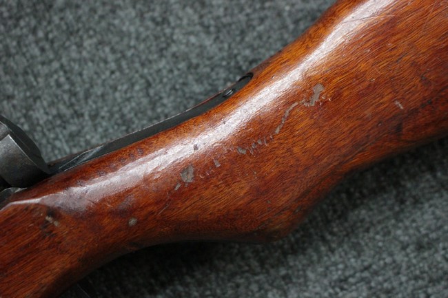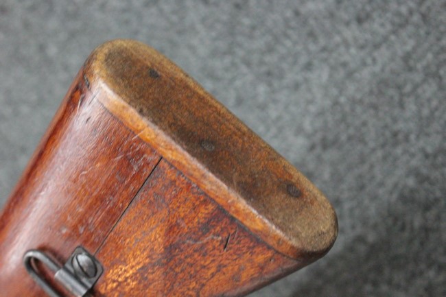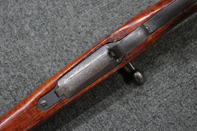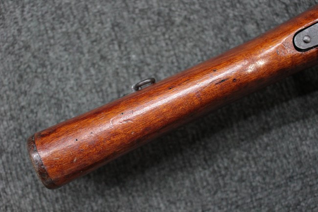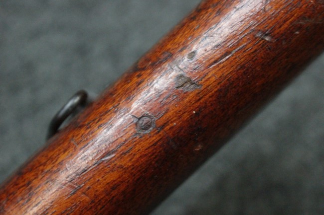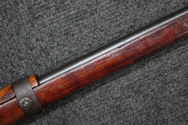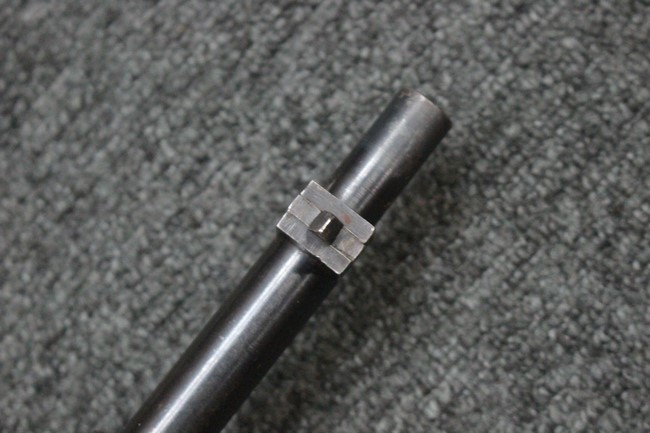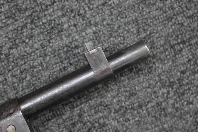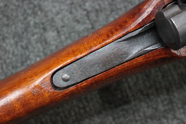 槓桿 (ボルト・ハンドル) は丸く、安全子は溶接痕の有るタイプとなっています。 照星(フロント・サイト)ガードが無い仕様で銃床が下帯部(センター・バンド)で分離式となっています。 また木被(アッパー・ハンド・ガード)が下帯までの短縮型で床尾板(バット・プレート)は木製 、上帯(フロント・バンド)は銃身に固定されており下帯には単脚取付基部が無く、さく杖は取付できない仕様となっています。 床尾負革止(リア・スイベル)はネジ1つで留めるタイプです。