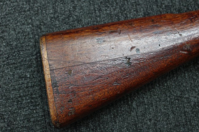 金属部は一部に退色などが見られますが、全体に良好な状態です。 銃床など木部には中央部左下側面などを中心に打ち傷等が散見されますが、時代が付いておりそれ程悪い印象は受けません。 ストックの合わせ目には若干の隙間が見られますががたつきはなく、3本の釘で打ち付けられたバットプレートもしっかりと固定されています。 ストック下部には2箇所、廣?と東洋工業を示す円形の刻印も確認できます。