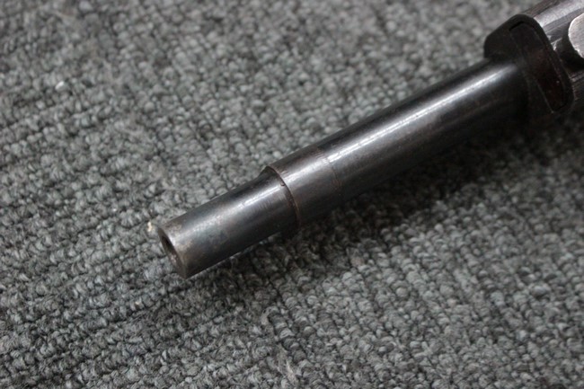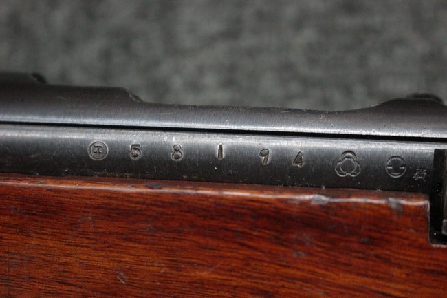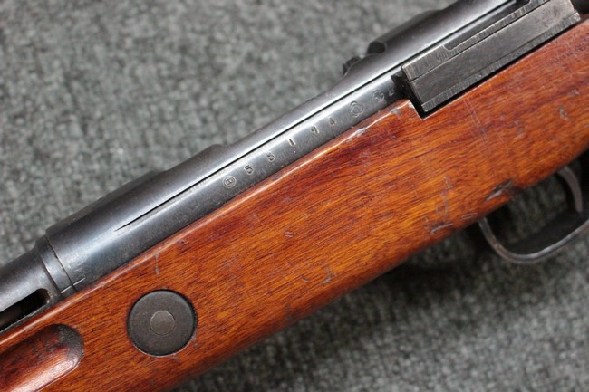 本品は九九式短小銃 末期型 (東洋工業製) です。 東洋工業は民間企業ですが、初期の段階から九九式の生産へ参加しており、名古屋、小倉工廠に次いだ生産数を誇りました。 機関部側面にはシリーズ<エ> とシリアルNo.58194に加え東洋工業製を示す刻印が打たれており、昭和19年中ごろから昭和20年初頭までの生産品である事が判ります。 薬室上部に九九式の刻印は元より無く、菊の御紋は削り取られています。