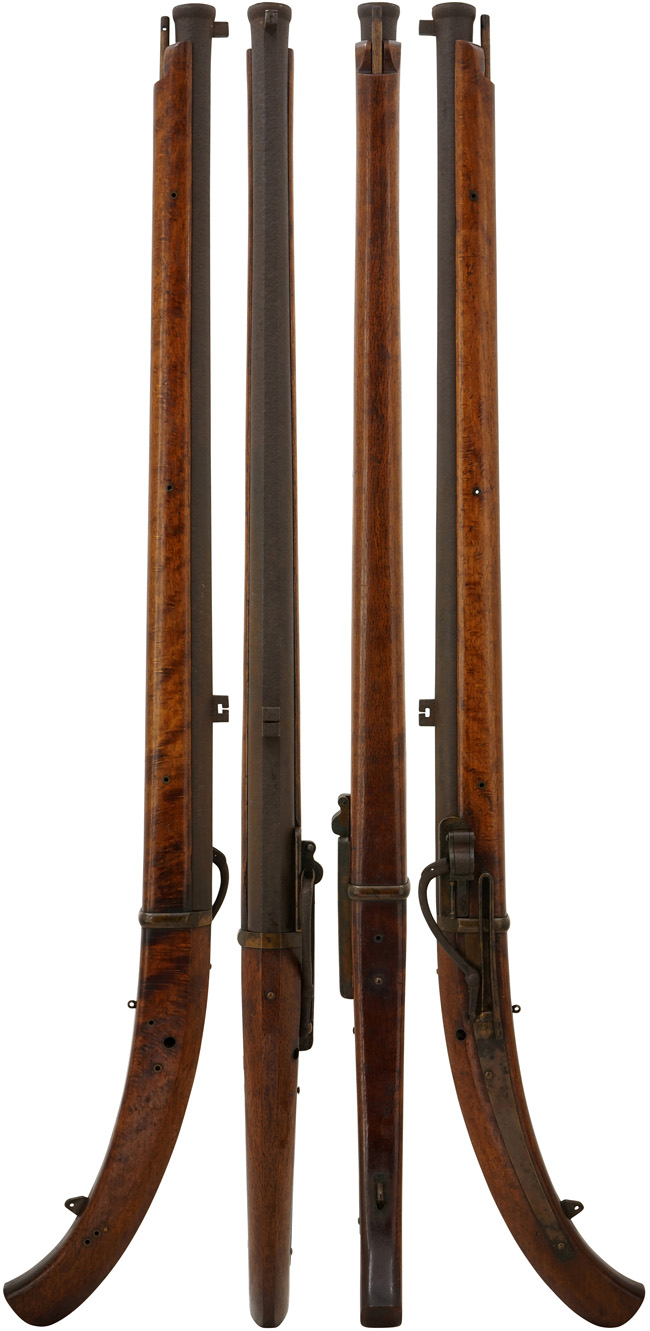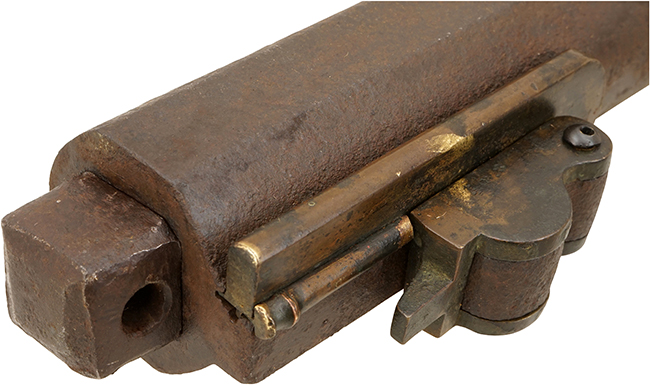 尾栓は現状では固着していますが、ねじ込み部分の基部には大きな錆は出ておらず、外れそうに見えます。 カラクリの作動については至極完全で、火挟を起こした際のロックはしっかりと掛かり、火挟が起きた状態で引金を引くと、火挟が力強く落ちます。 木製のカルカ (さく杖) が付属致します。