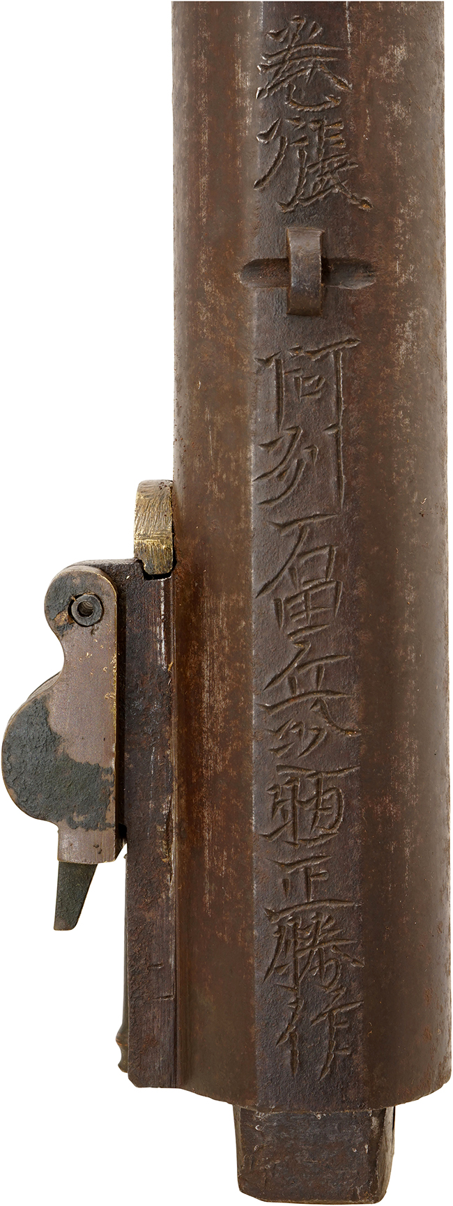 井上外記流の銃身は後方に向かって広がった丸銃身で、その上面だけを平らにした「表一角」と呼ばれる形状で、銃口部に寸の詰まった丸柑子が設けられている品が多くあります。 銃床は芝引部分が特徴的なカーブを描く井上外記流独特の形状となっており、洋式銃の影響を受けたものと言われています。 尚、カラクリは外記カラクリとなっており、蟹の目隠しは水滴型となっています。 引金は輪引金となっており、用心金やナマコ金は設けられていません。 これは井上外記流の特徴でもあります。 本品の引金は阿波筒と同じ三角形になったところに阿波鍛冶の作である事が伺われます。阿波国では掟に従った火縄銃を使用したことから、本品は阿波鍛冶の作ではありますが、隣の讃岐国からの注文筒であったと思います。 讃岐国では井上外記流を多く使用したので讃岐筒=井上外記流と思われているほどです。