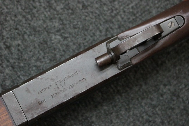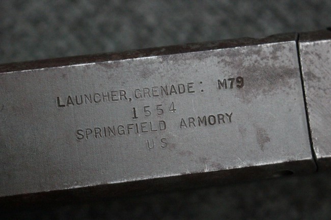 本品は米国製オリジナルのM79 グレネード・ランチャーです。 本体下面には「LAUNCHER, GRENADE: M79」のモデル名刻印に加えて、シリアルNo.1554及び「SPRINGFIELD ARMORY US」のメーカー刻印が打刻されています。
