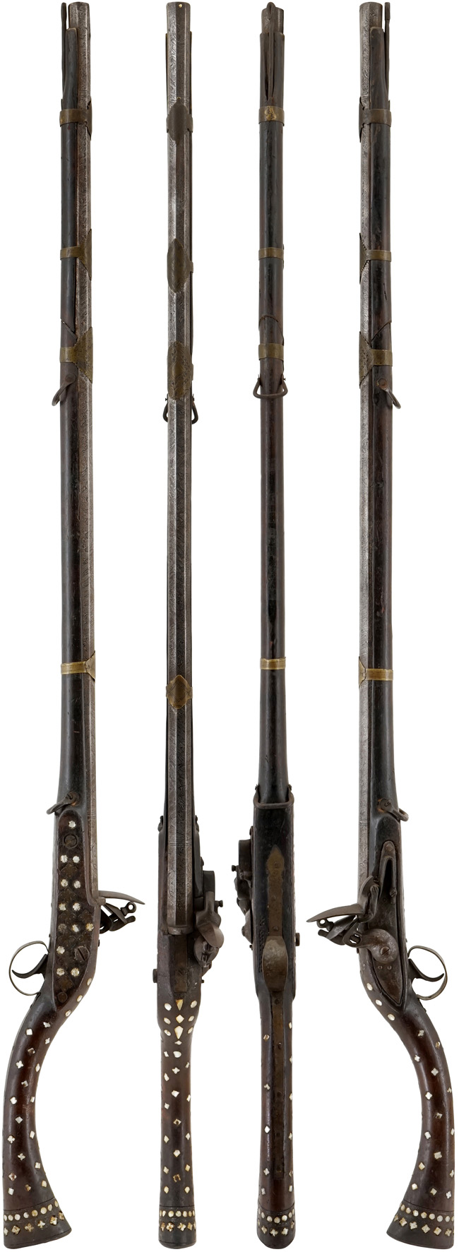 Jezail(ジェゼイル)とは、インド、中央アジア、中近東でおよそ100-200年前に遊牧民族によって使用された前装式の小銃で、戦いの際は軍用銃としても使用されました。 Jezail(ジェゼイル)はメーカーや生産国で分類する事の出来ない、バット・ストックが三日月型に曲がり全体的に細長い形状の、民族的な装飾を施された小銃全般を指します。 本品は銃尾の広がり幅が比較的狭く、バットストックの全体的な形がカーブが少ないあまり湾曲していないストレートな形状の珍しい部類になります。時代的には1800年代初期に作られたと思われます。