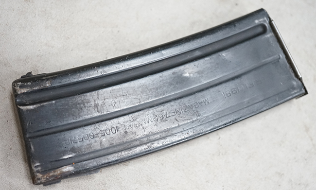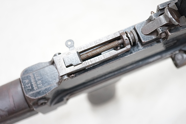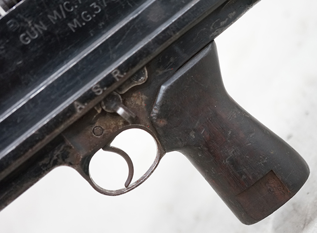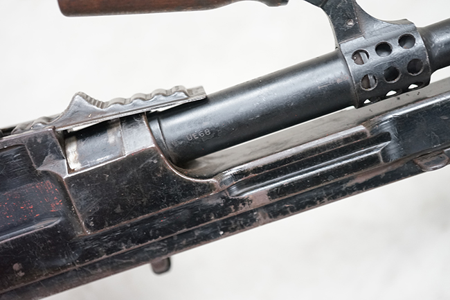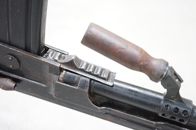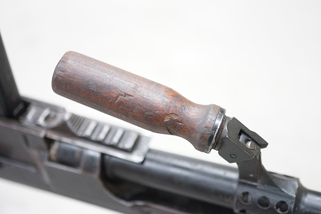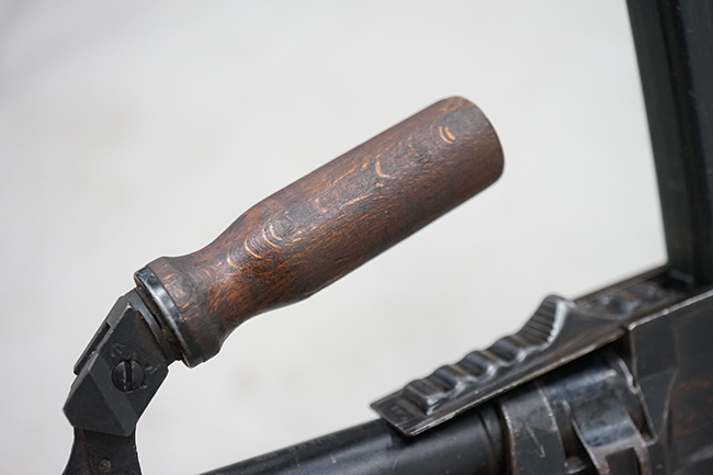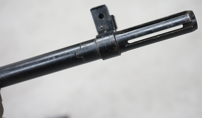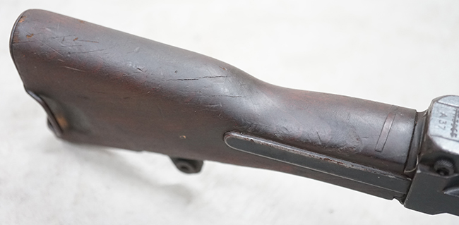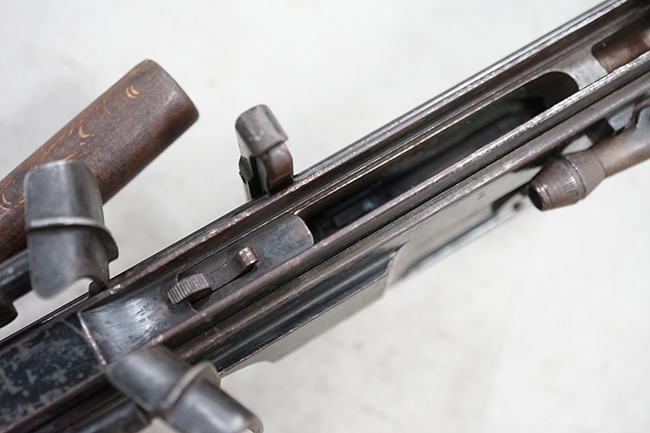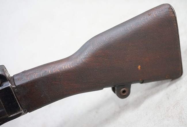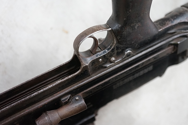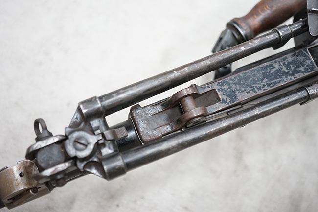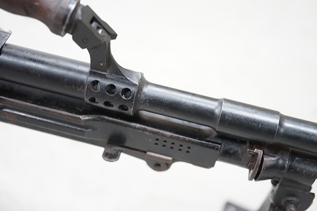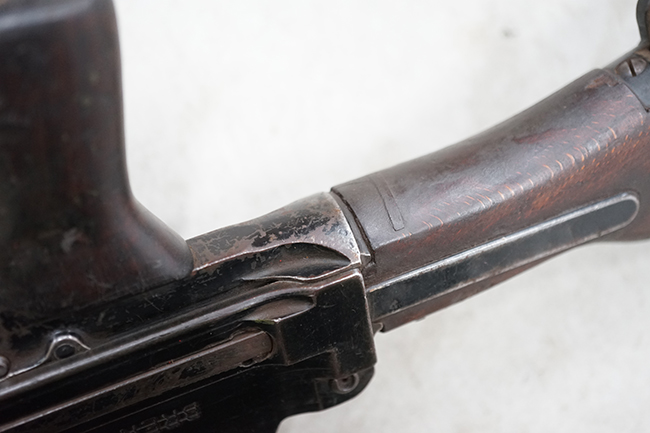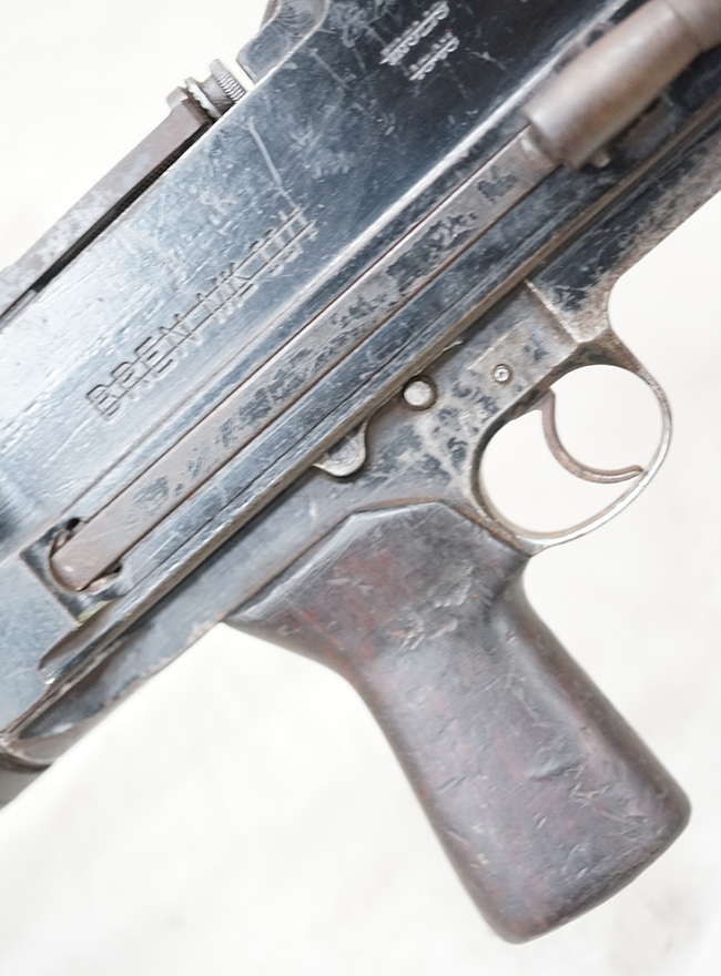 本品は全体に適度に使い込まれたコンディションとなっており、機関部や銃身等の金属部については、全体に打ち傷や擦れ、経年による褪色の他、一部表面錆等が見受けられるものの、目立った欠損等は見受けられず、概ねしっかりとした状態が保たれています。 木製のグリップやバット・ストック、キャリング・ハンドルについては、やや打ち傷や線傷が見られる他、一部に若干の欠けや補修痕が見受けられます。 マガジンの着脱やリア・サイトの起倒・調整、二脚の展開・伸縮、キャリング・ハンドルの角度変更等については問題なく行う事が可能です。 尚、付属のマガジンは一部が固定されています。