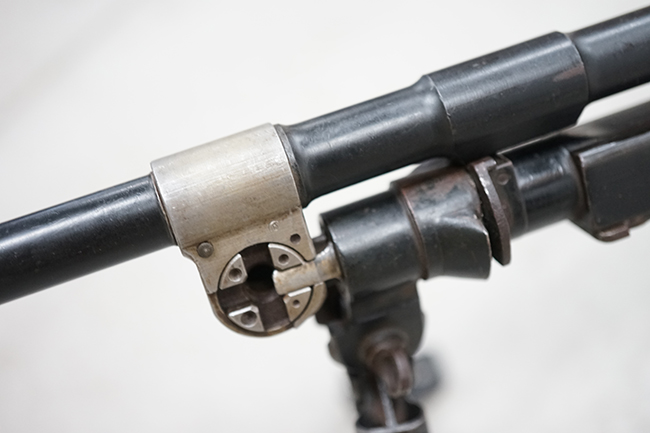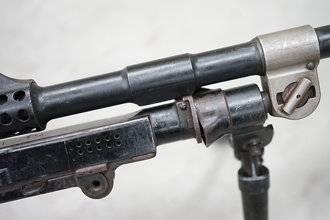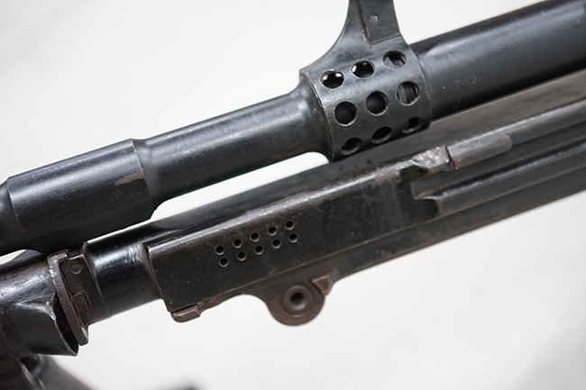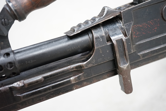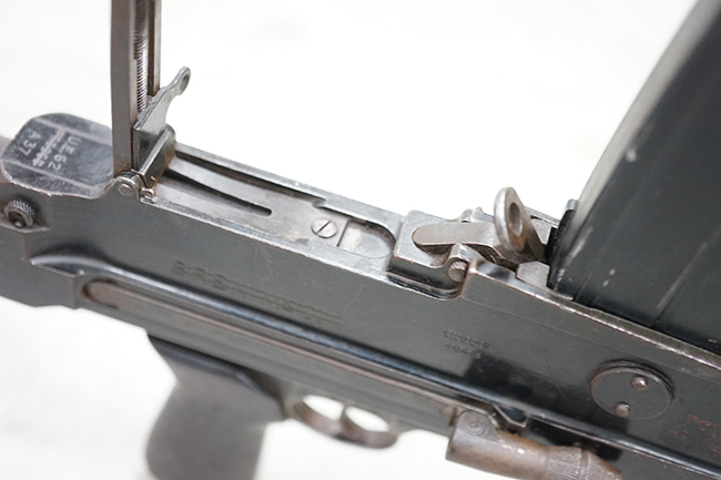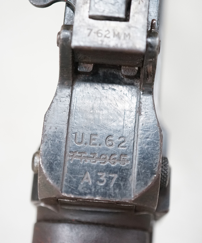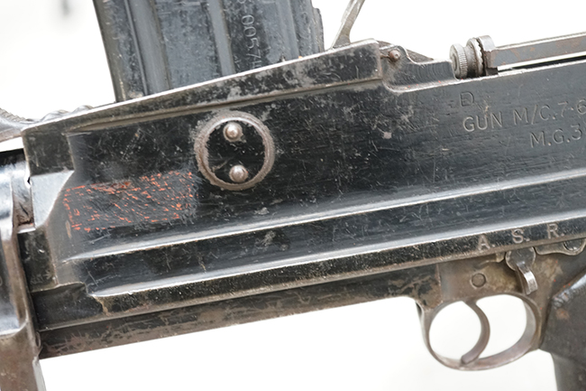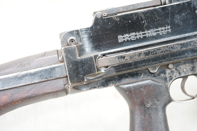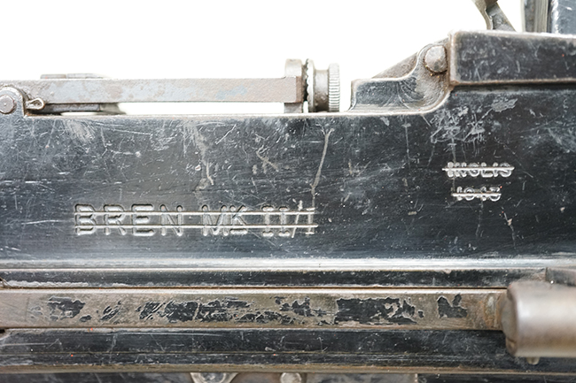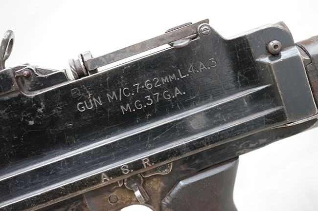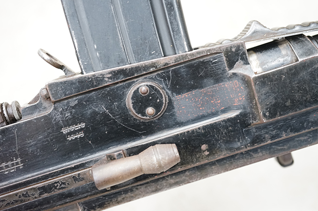 本品は非常に珍しいブレン L4A3 軽機関銃で、レシーバー左側面にはエンフィールド造兵廠を示すEFDのロゴの他、「GUN M/C. 7・62MM L.4.A.3 M.G.37G.A.」のモデル名が入っています。 レシーバー右側面には元々のモデル名である「BREN MK II/I」の刻印及び「INGLIS 1943」のメーカー刻印が入っており、横線により打ち消されています。 レシーバー上面のシリアルNo.は打ち直しにより「U.E.62 A37」と入っており、本品が1962年にL4A3に改修された事が窺えます。 その他、銃身に「7・62MM」の口径表示及びMG5526のシリアルNo.が確認出来ます。