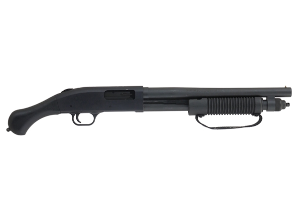 モスバーグ M590 ショットガンは、1975年にモスバーグ M500 ショットガンの軍及び法執行機関向けの特別モデルとして開発されました。 基本設計はM500と同様ですが、耐久性や信頼性の向上が図られています。 銃身上にはヒート・シールドが標準装備され、着剣装置の有無が選択可能となっていました。 また、反射防止のため、金属部表面はマット仕上げのみとなっています。 口径12GAの20インチ銃身で装弾数8発の標準モデルと、14,5インチ銃身で装弾数6発のショート・バージョンが用意さました。 発売後はその信頼性の高さから一般の警察用装備としても注目され、18,5インチ銃身のライアット・モデルも追加されました。 後にセルフ・ディフェンス用として民間市場への販売が開始され、20GA及び.410口径のホーム・ディフェンス・モデルも登場しました。 モスバーグ M590 ショットガンは官民問わず広く使用されている事から、仕様の異なる数多くのモデルが存在しており、現在も同社を代表するショットガンとして販売が続けられています。