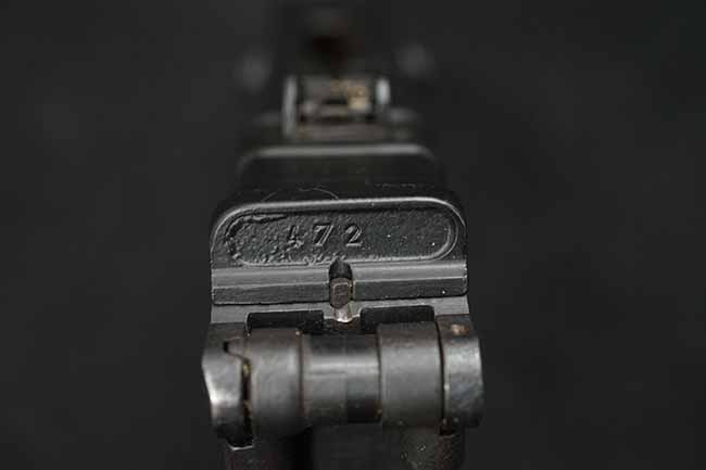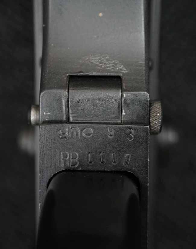 本品は.380ACP弾仕様のCZ91Sで、本体左側面にはCz社のロゴに加えて、「CZ 91 S」のモデル名や口径表示刻印、「CZECH MADE」の刻印が打刻されています。 本体下面のマガジン・ハウジング前方にはシリアルNo.に加えて「she 93」の刻印が入っている事から、本品が1993年に製造された事が窺えます。 尚、シリアルNo.はアッパー・レシーバー及びロア・レシーバーで一致しています。 本品は民間向けモデルのため、セレクターは「0 (安全位置)」 及び「1 (セミ・オートマチック)」のポジションのみとなっています。
